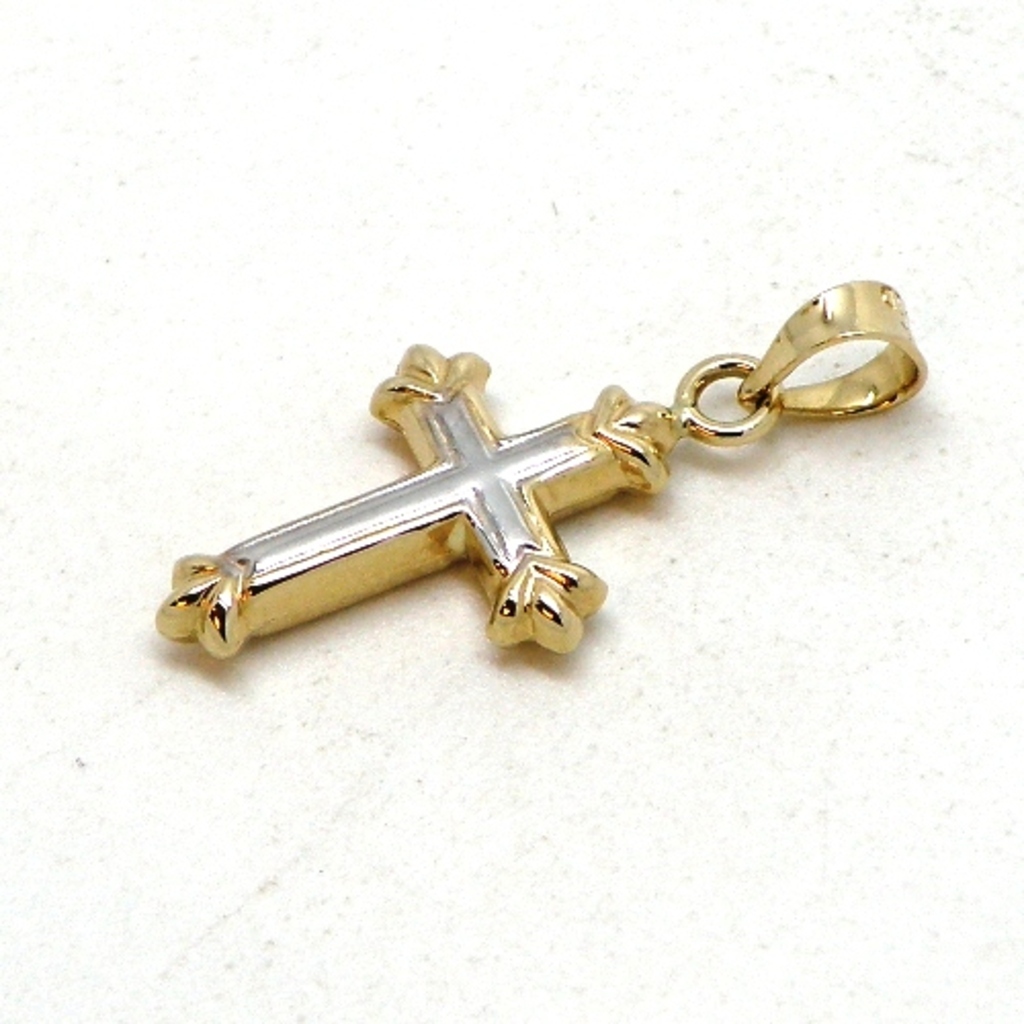 14k two-tone gold cross pendant. This marvelous cross features a fleur de lis on the four ends of the cross. The pendant features two different golds, that being yellow and white. This is a light weight cross, it weighs 0.45grams and measures 22mm (including the bail) x 11mm. It has a secure loose bail to be worn carefree all day. The metal purity is 14k; it is hallmarked. This item will sure bring you years of enjoyment and be an excellent piece to add onto your collection.