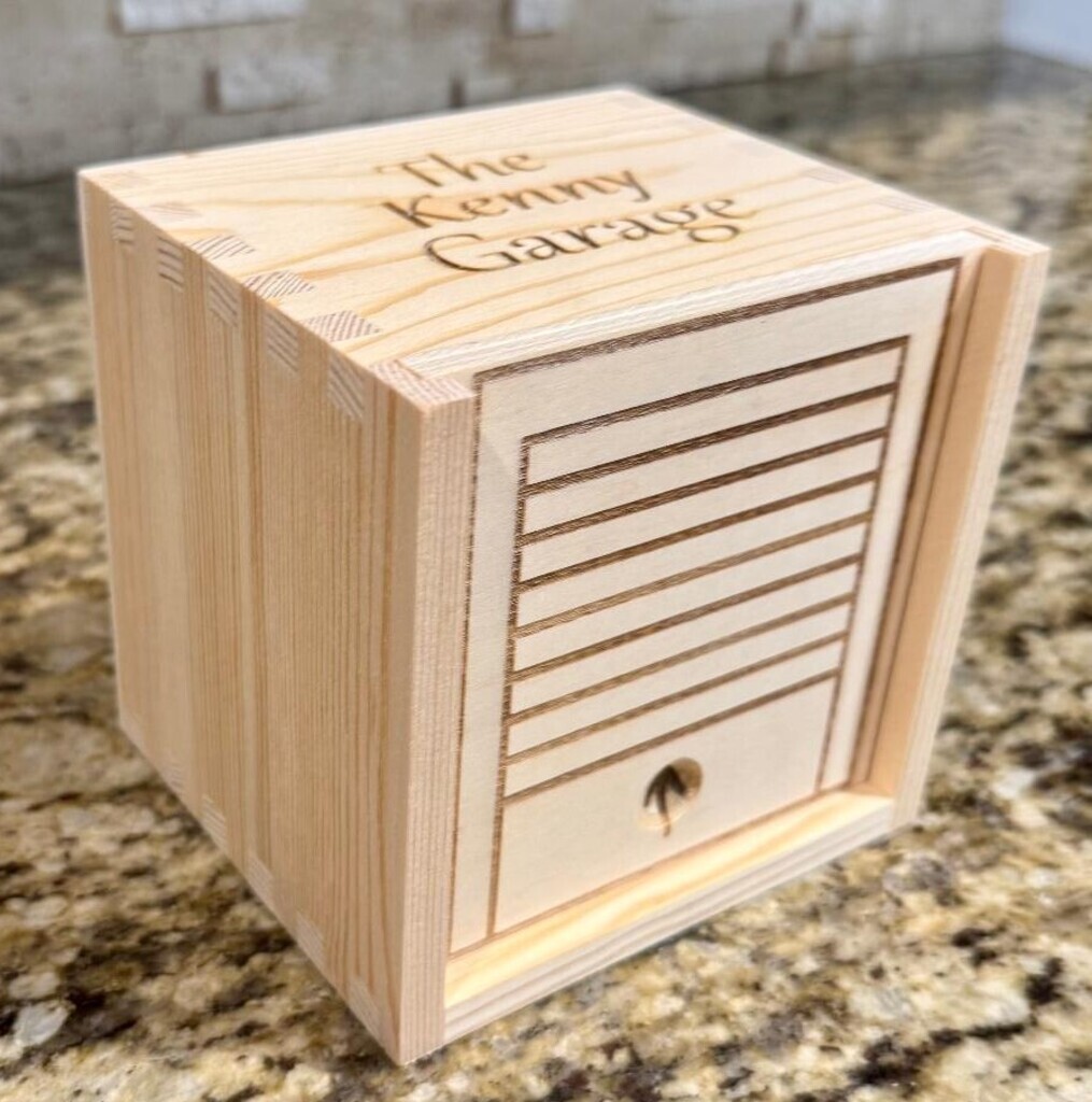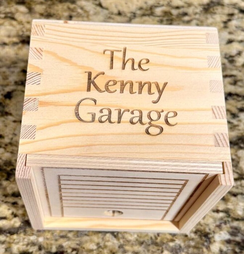 This personalized box with family name is designed to look like a garage and comes with up to 4 cars also personalized with names. Box measures 4.5 inches by 4 inches by 1.5 inches.