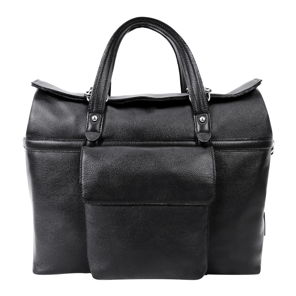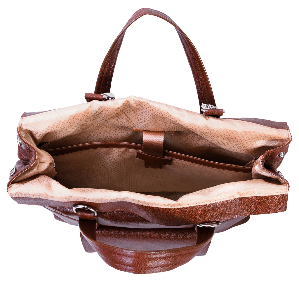 Leather Roll Top Laptop Briefcase with dual clasps closure. Front easy access pocket with flap over magnetic closure. Fully-lined interior with leather trim and silver accent hardware. Interior compartment features built-in laptop protection, tablet pocket and organizer for business cards, pens, and accessories. Back features secured zipper pocket. Removable and adjustable nylon strap with leather shoulder pad. Leather smart strap for piggy-backing onto rolling cases.