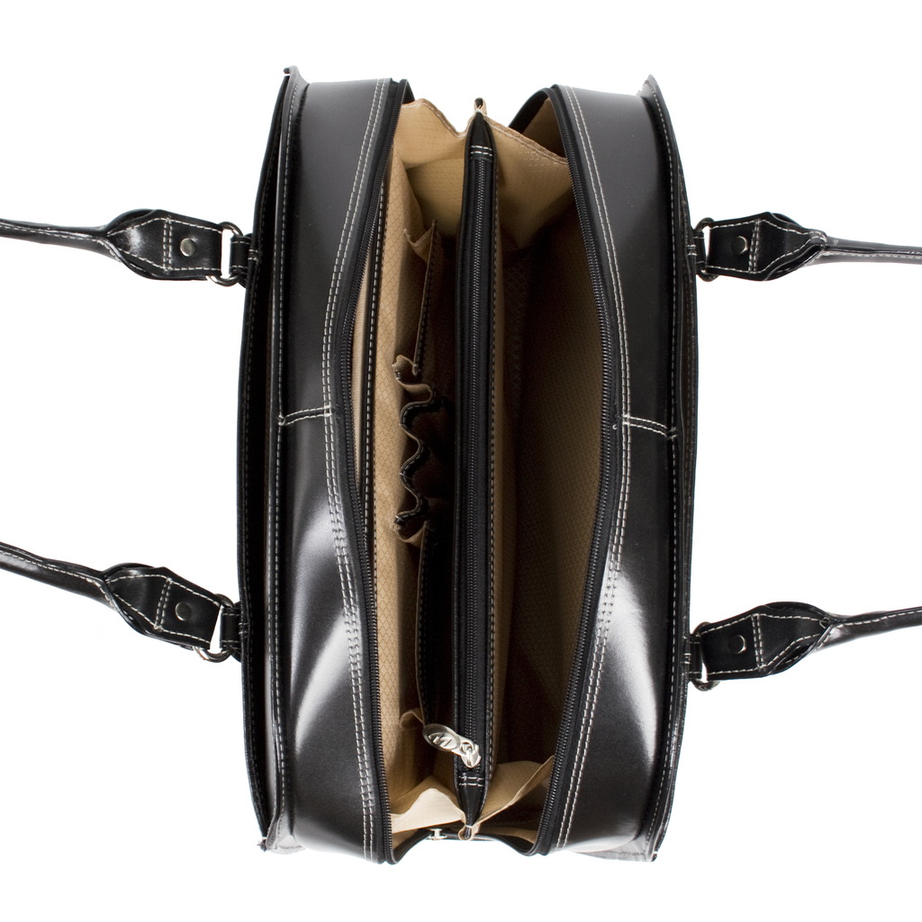 Briefcase offers small front pocket. Front pocket for files. Back pocket for accessories. Main compartment features an interior zipper pocket and an interior organizer for pens, business cards and small devices. Built-in high-density compartment protects laptops up to 14" in screen size.