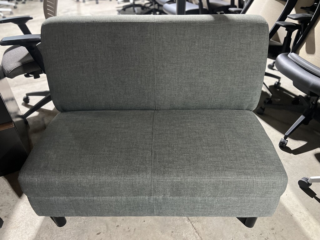 Pre-owned, gray sofa. This modern two-seater offers versatile seating for offices, lounges, or waiting areas, combining durability with contemporary style