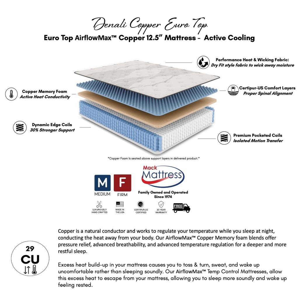 The Denali Euro Top Medium Hybrid Mattress with Copper Memory Foam offers a great, comfortable, and affordable night's sleep. The Euro Top layer provides greater comfort and a more traditional feel while still experiencing the benefits of all a hybrid mattress has to offer.