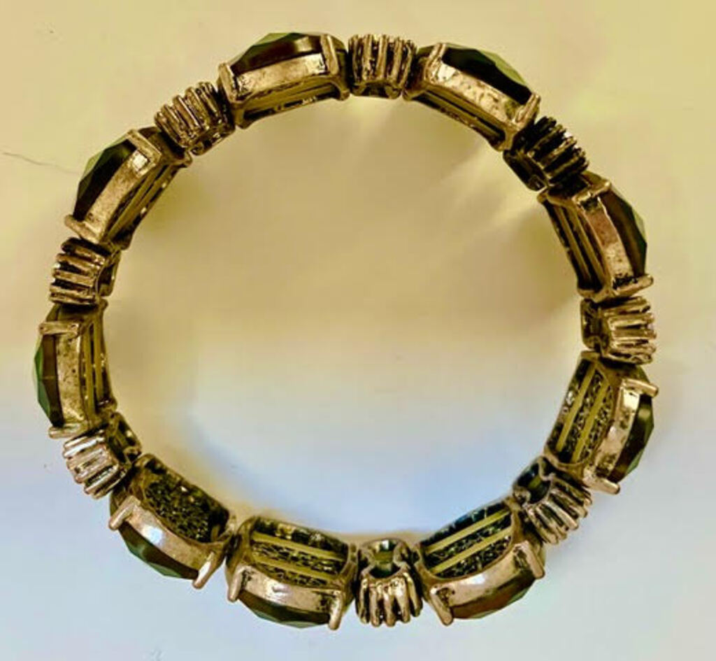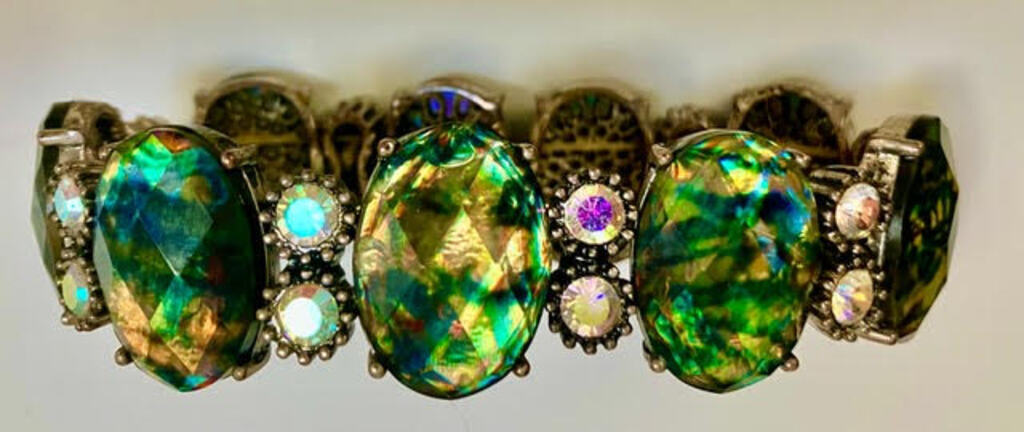 New Green Art Crystal Bracelet. One size. Stunning faceted green with large clear glass crystals. Measures 6” Around Inside.