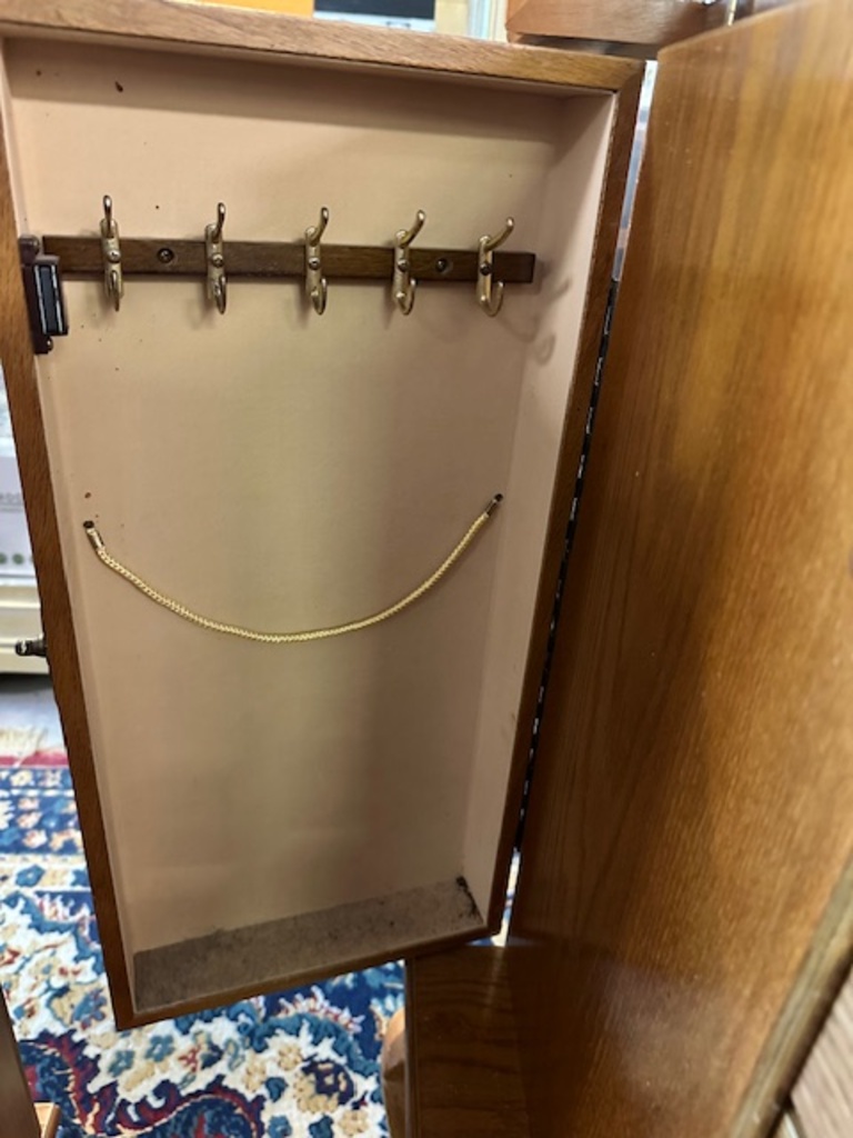 This antique jewelry stand has enough space to hold all your valuables. Two doors on the side open for all your necklaces. The drawers work great. This stand is ready to hold more memories!