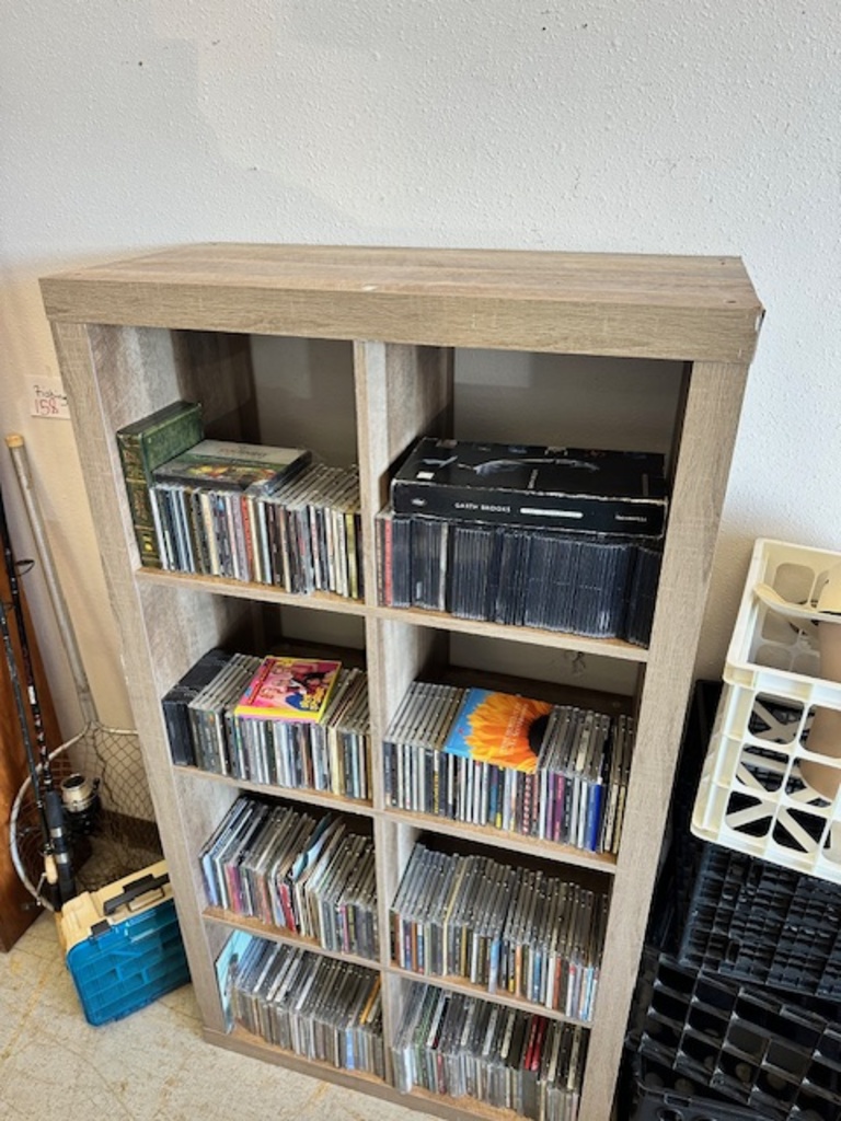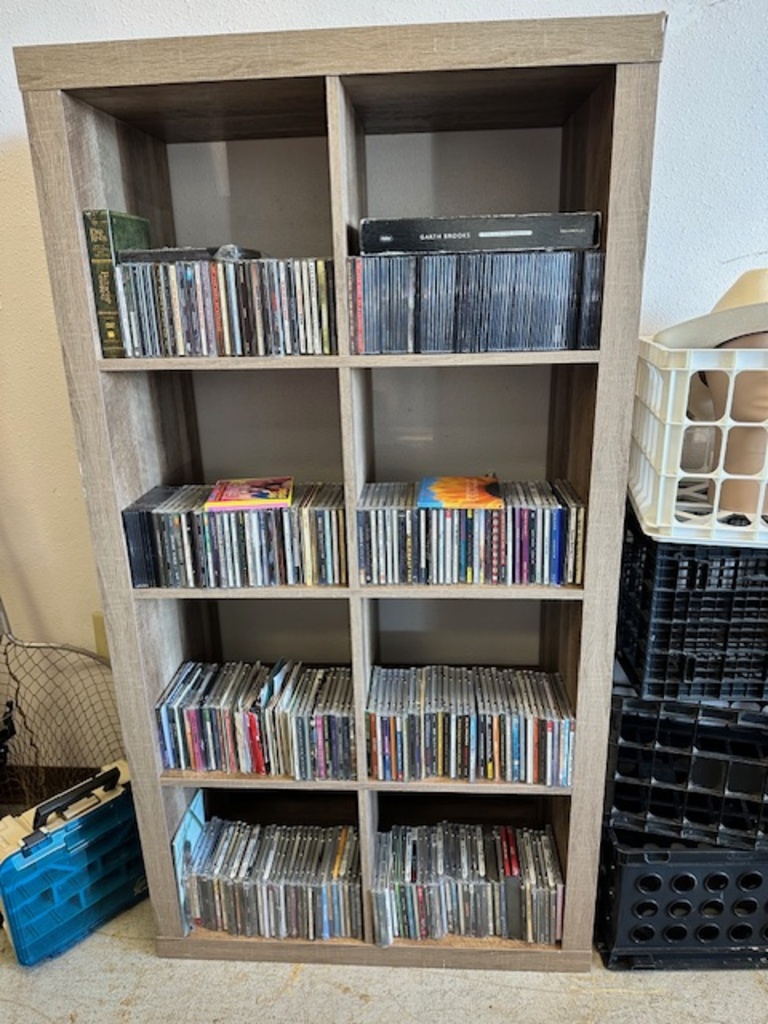 The cubed shelf does NOT come with the CD's that are stored there. This shelf can be stood vertically or horizontally. Great condition!