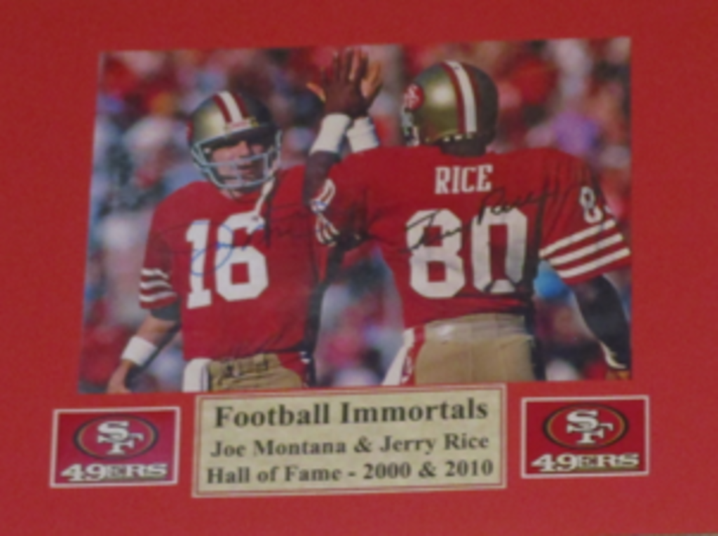 Joe Montana/Jerry Rice double autographed 8x10 photo tribute, with authenticity. 300 IMS plus $40 cash tax and shipping. pay by check only.