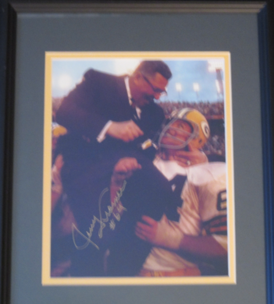 Jerry Kramer autographed in gold sharpie Super Bowl celebration with Lombardi. 8x10 custom framed with authenticity.