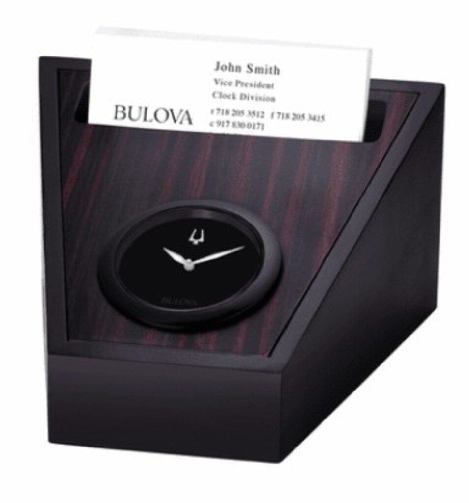 This compact Bulova clock is multifunctional and adds an elegant accent to your desktop! It has a black aluminum frame around a striated wood veneer body, and is designed in a modern wedge shape. The black dial is set with a silver Bulova tuning fork icon at 12:00, has silver hands, and a glossy black bezel. The clock features a slot for a smart phone and another for business card display. It can be laser-engraved with up to 3 lines of text for free, and comes packaged in a gift box.