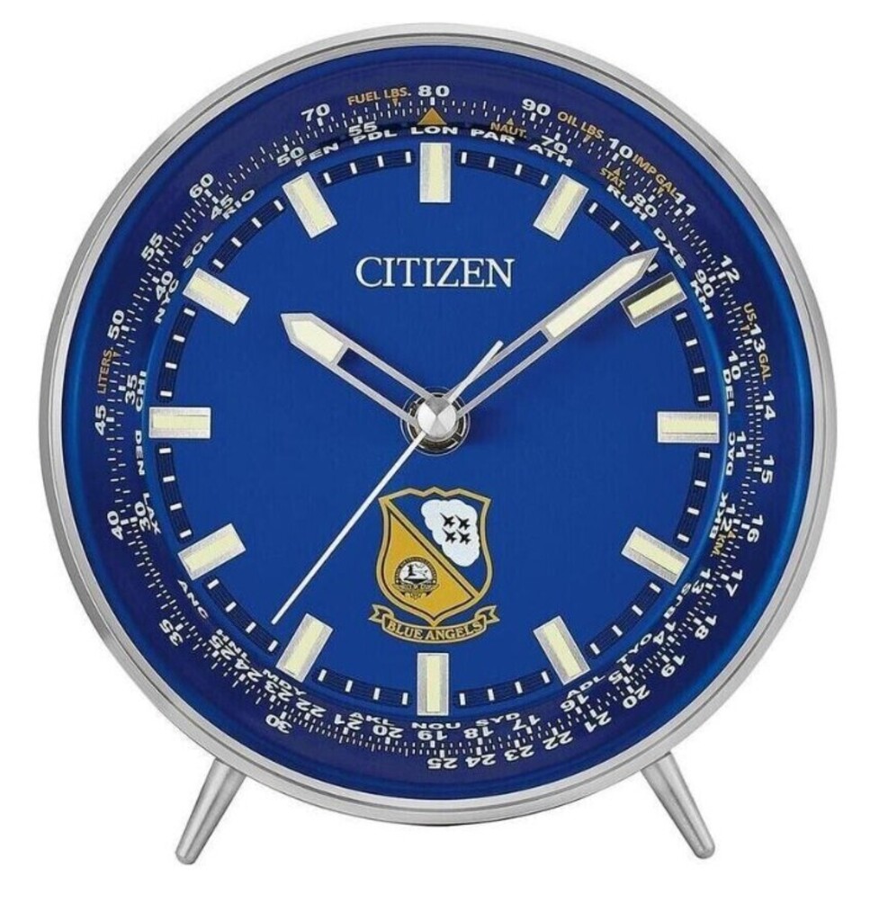 The Citizen Blue Angels Desk Clock is a stunning timepiece featuring a 6" diameter dial with a patriotic design inspired by the Blue Angels. This clock is powered by a reliable quartz movement and includes a snooze alarm for added convenience. Crafted from stainless steel and plastic, this modern desk clock is a perfect decorative collectible for any room. The clock's Americana style and military theme make it a unique addition to any collection, showcasing both quality craftsmanship and a nod to national pride.