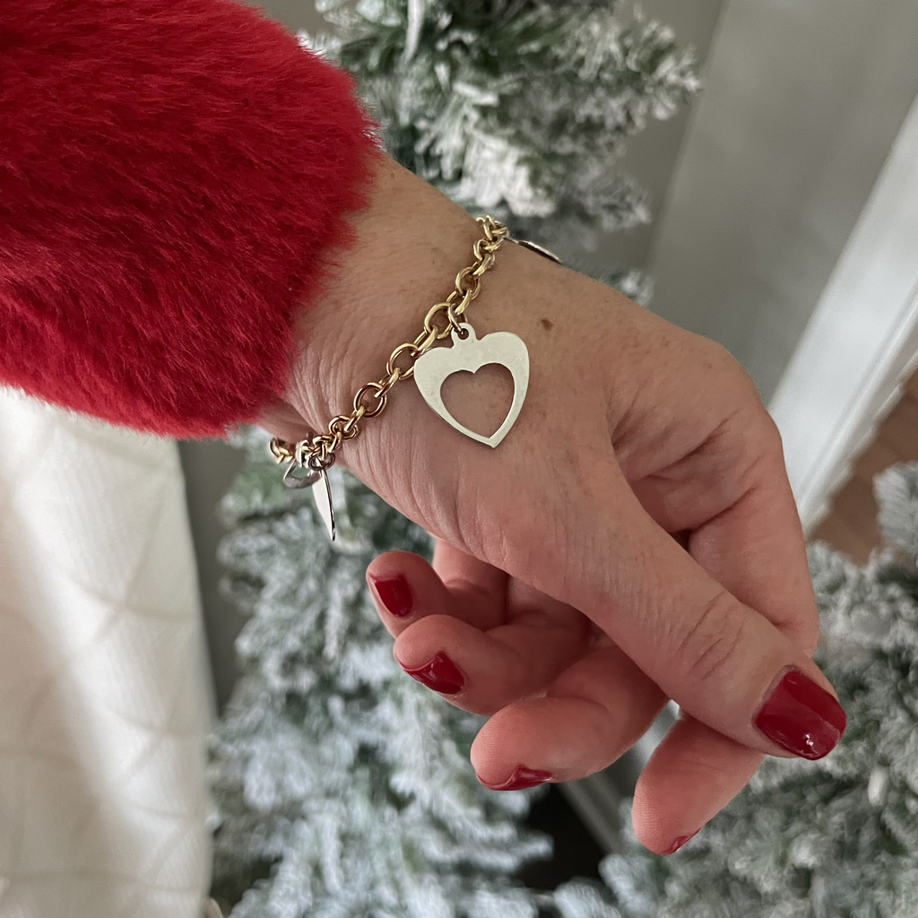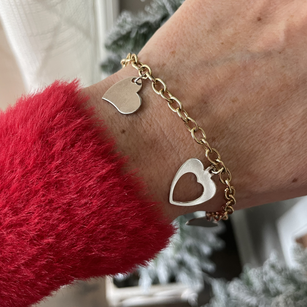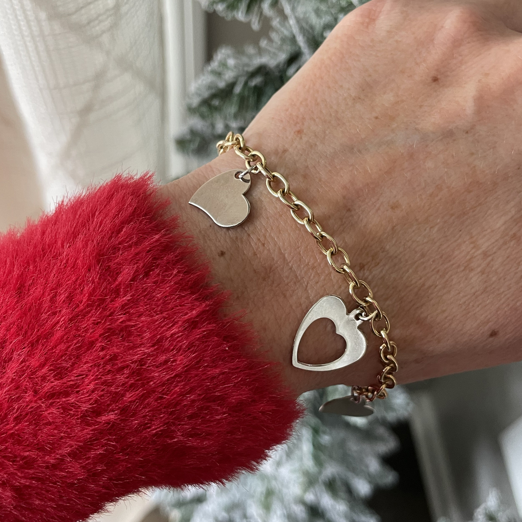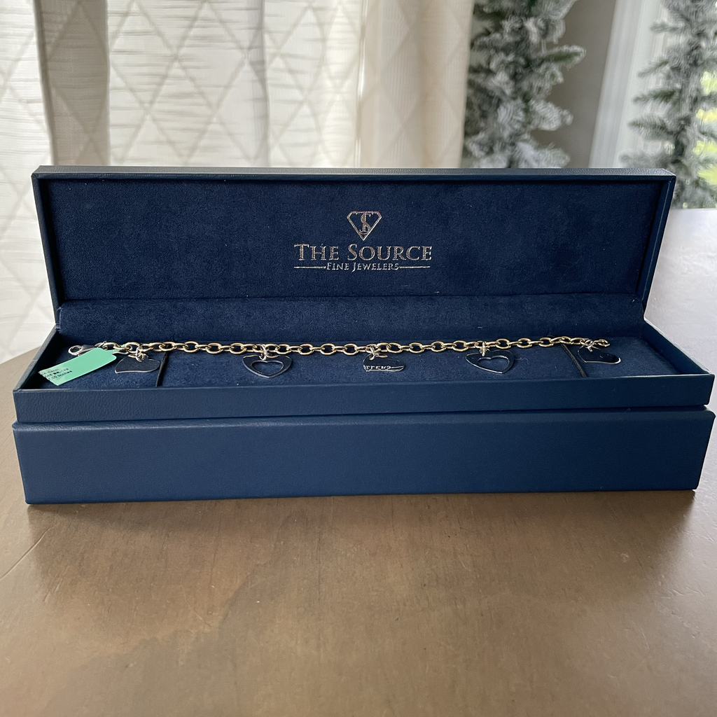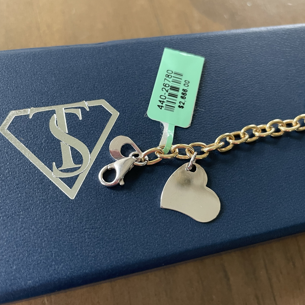 TSFJ Collection 14 Karat Yellow Gold 7 Inch Fancy Link Bracelet with 14K White Gold Heart Accents featuring a Lobster Claw Clasp. #440-26780.