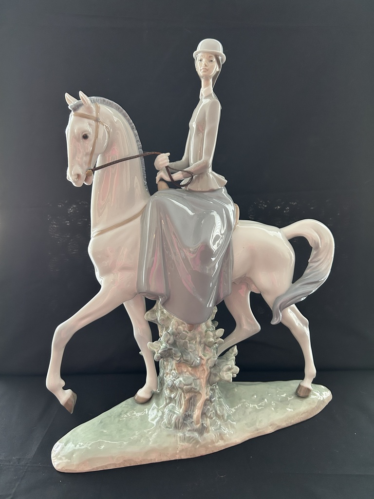 The Lladro Female Equestrian Woman Side-Saddle on a White Horse figurine is a beautifully crafted porcelain collectible from Spain. This figurine features a woman riding a white horse in a side-saddle position, showcasing intricate details and vibrant colors. Perfect for horse enthusiasts and collectors, this figurine captures the elegance and grace of the equestrian world in a timeless and unique display piece.