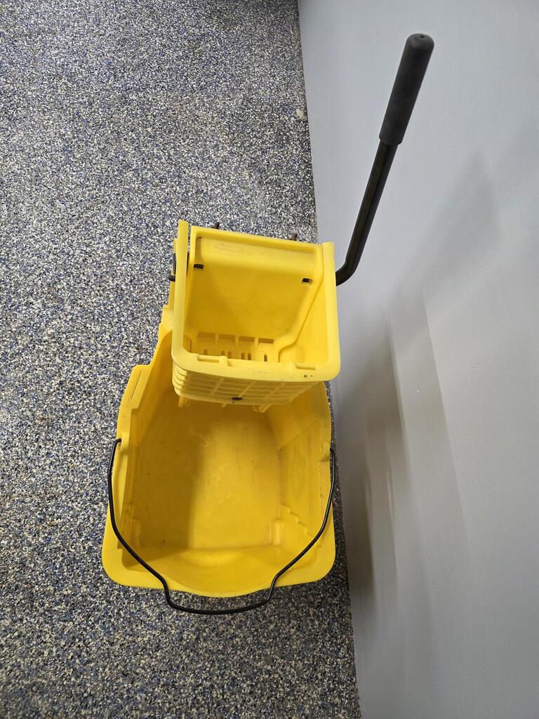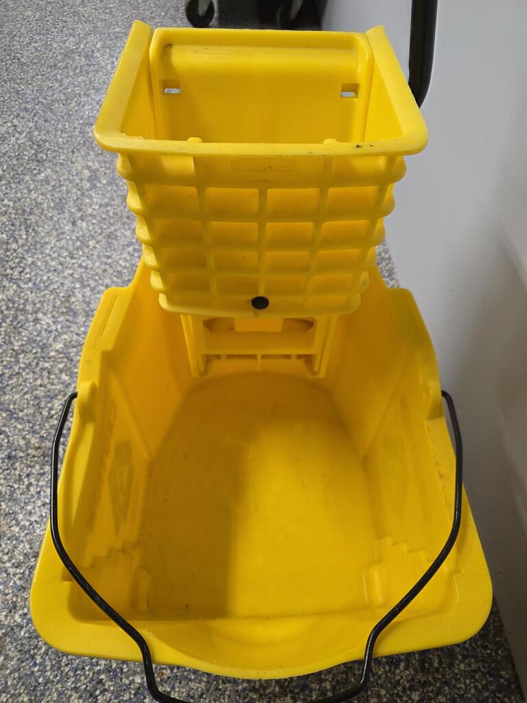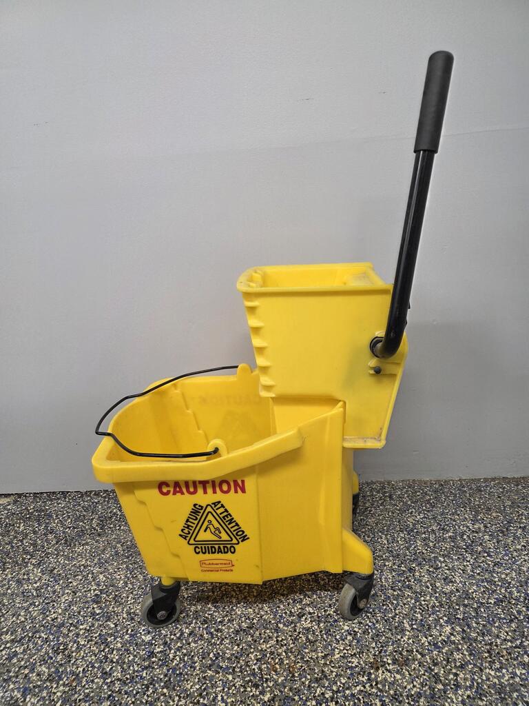 Heavy-Duty Rubbermaid yellow commercial mop bucket with wringer. Ready for daily use.