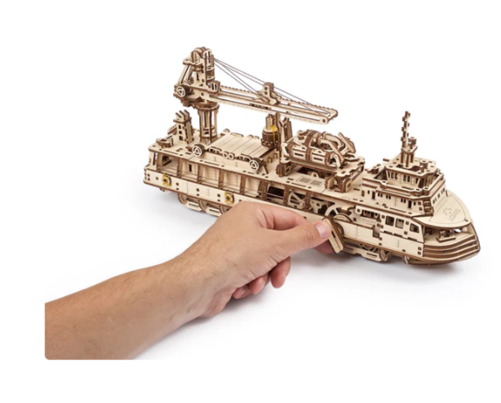 Time to weigh anchor and go full speed ahead towards new discoveries with Ugears nautical model, the Research Vessel.