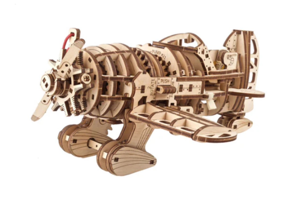The Ugears Mad Hornet Airplane features two modes: pre-flight check mode and taxi mode. In check mode the propeller spins while the wing flaps and tail rudder wiggle, before the aircraft switches automatically to taxi across the airfield to the runway for takeoff. In taxi mode your aircraft starts taxiing immediately, traveling up to 2.5 meters!
