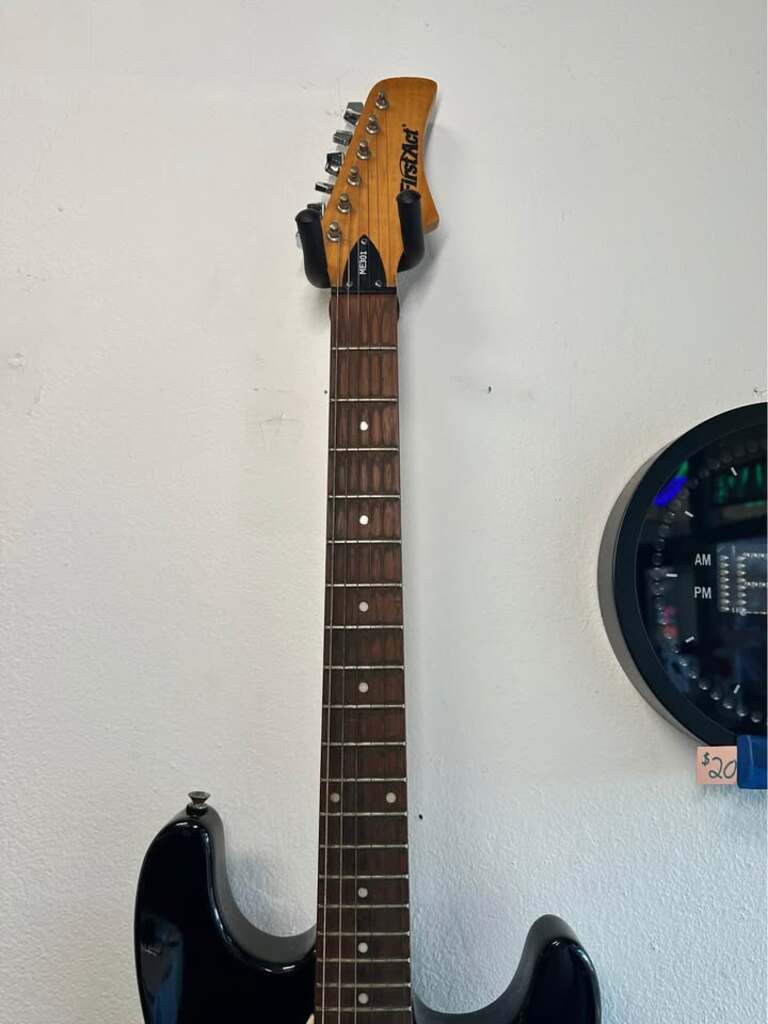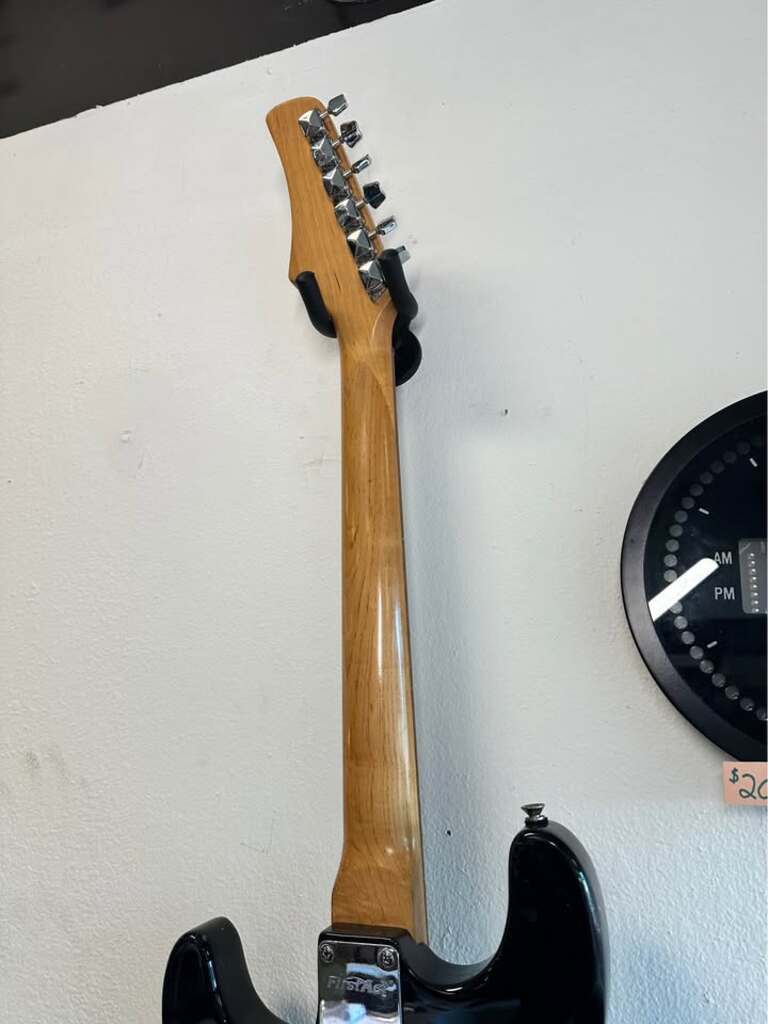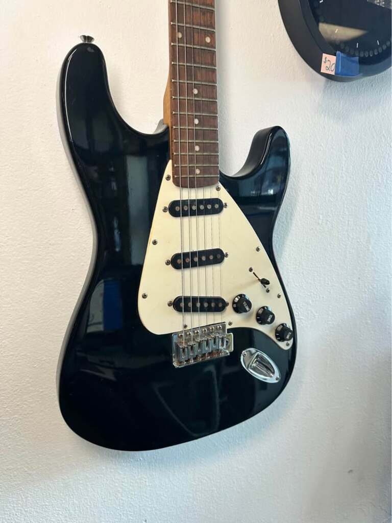 Hardware: Tremolo bridge, covered tuning machines, one volume and two tone controls, and a 5-speed switch.