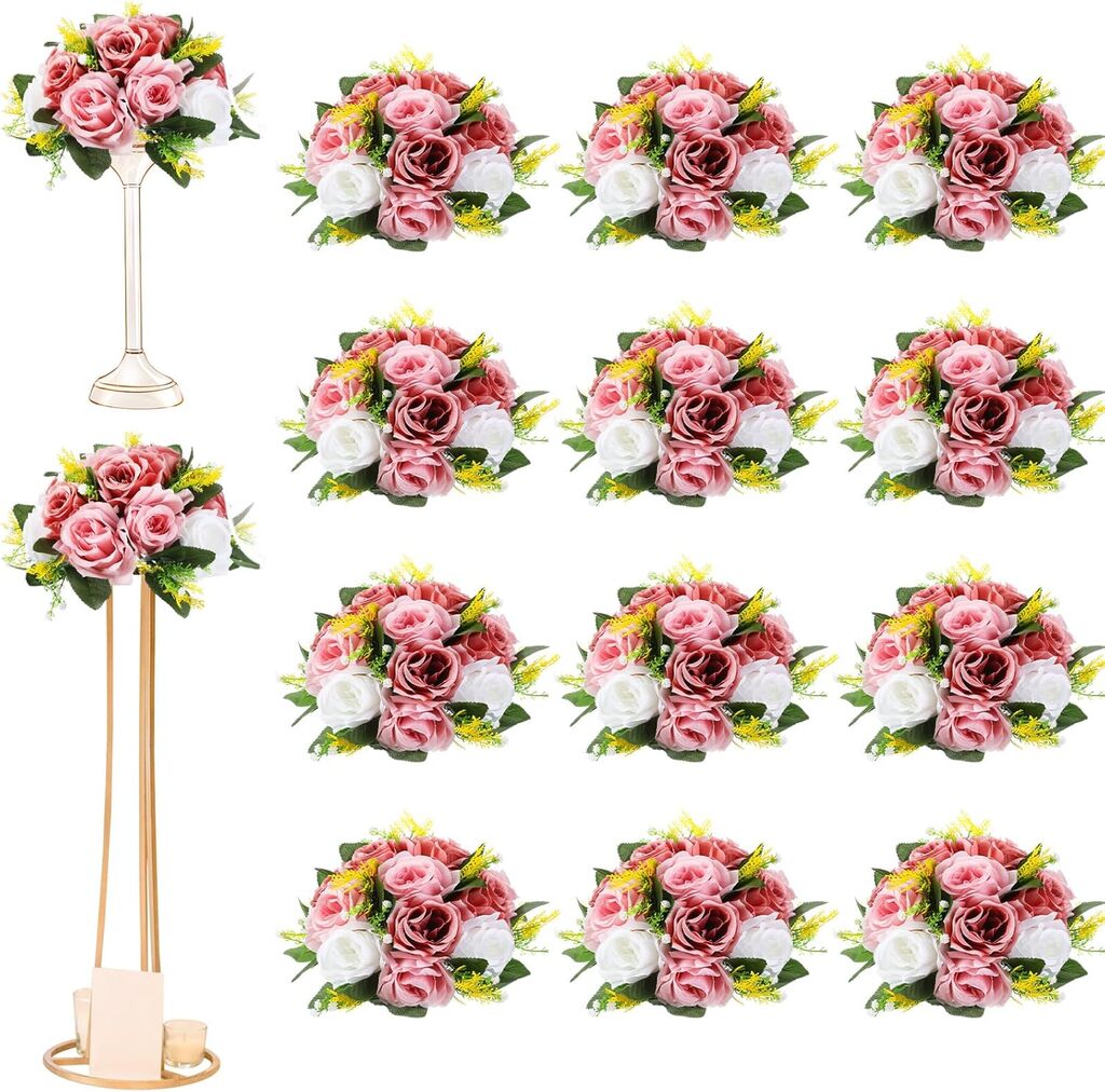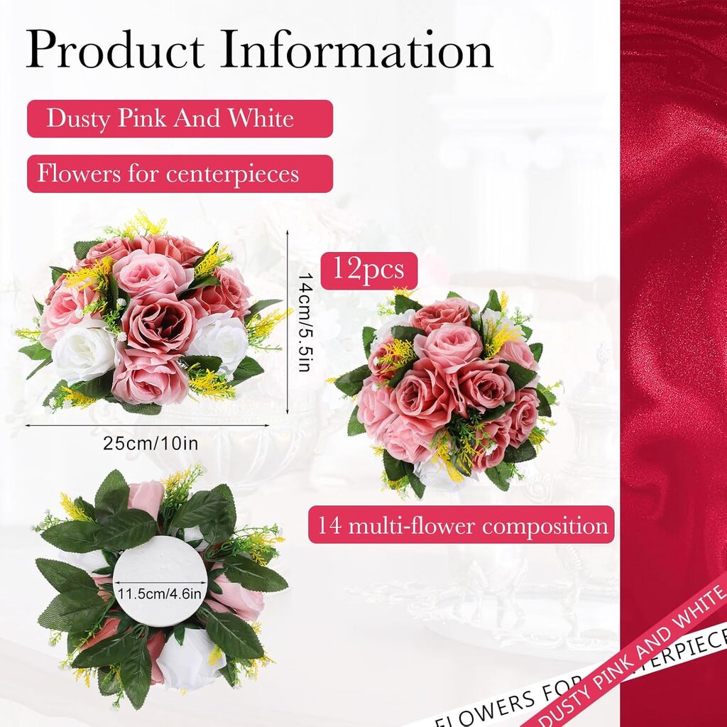 Hotop 12 Pcs Flower Balls Wedding Rose Centerpieces Silk Flower Kissing Balls Arrangement Artificial Hydrangea Flower Bouquet Faux Rose Floral Decoration (Dusty Pink, Pink, White)