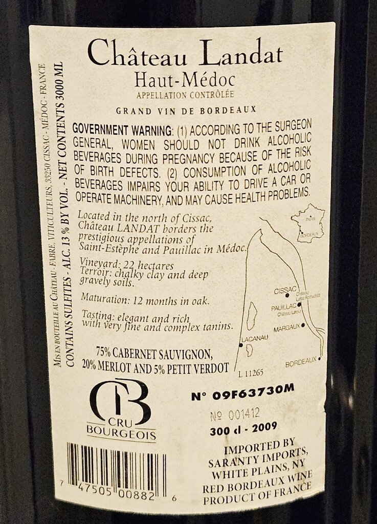 I’m offering a 3000 ml (3L / Double Magnum) bottle of Château Landat Haut-Médoc 2009, a well-regarded Bordeaux from a strong vintage.
