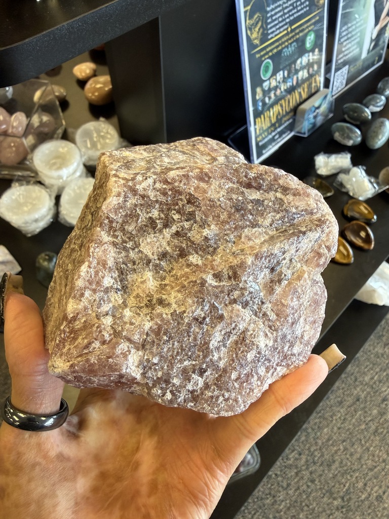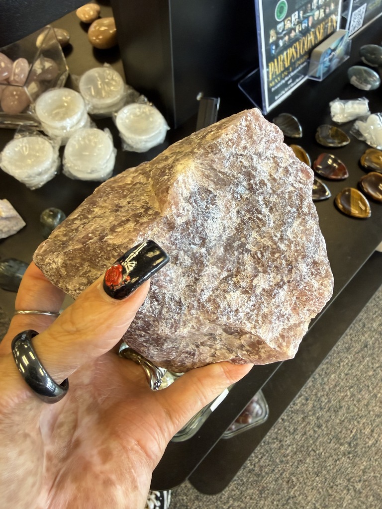 Strawberry quartz contains iron rich inclusions that not only give it its color, but provides grounding energy as well. Works with the heart chakra to foster self love. Energetically pairs well with emerald.