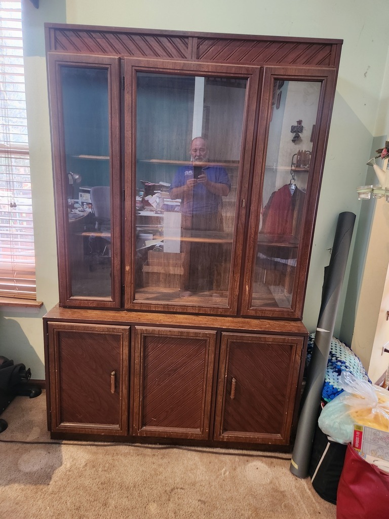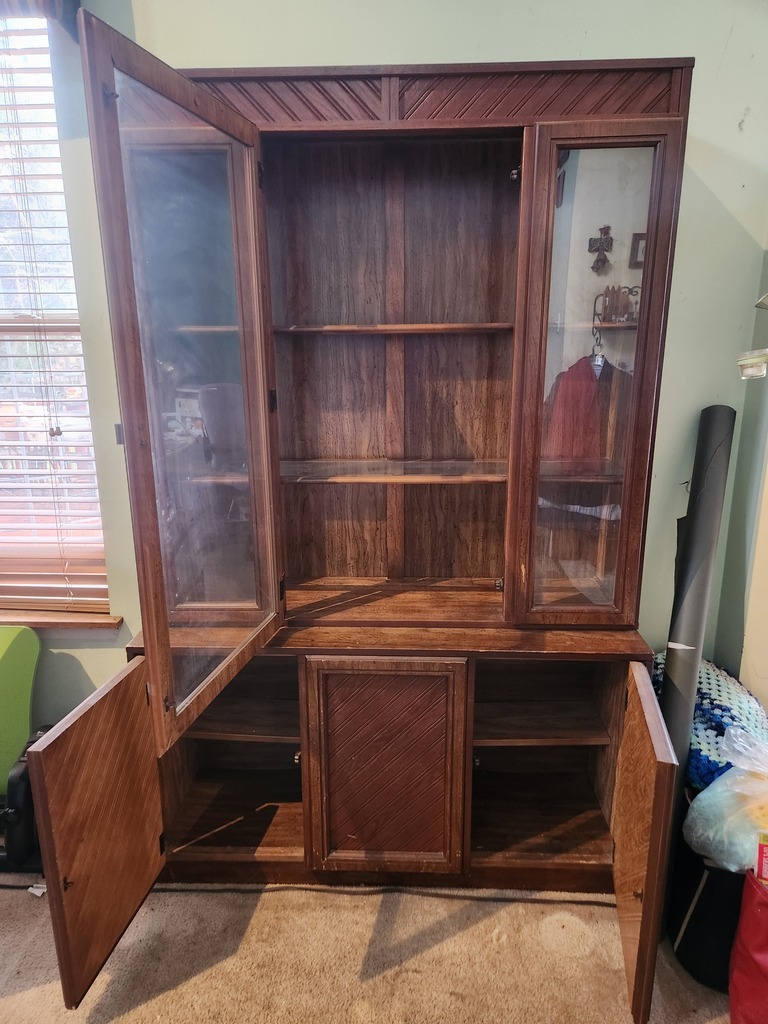 Spacious solid wooden display cabinet with glass doors and shelves.