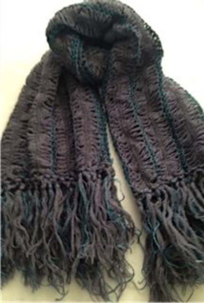 This fabulous warm scarf is grey with turquoise accents. It measures 74” Long 26” Wide. Excellent Condition. --ALL SALES FINAL!