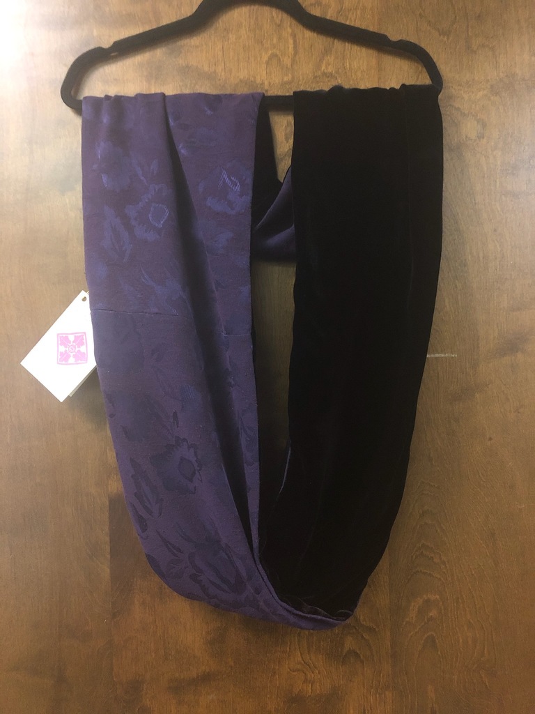 Color Muse hand-painted and hand-printed double-layer 100% silk and rayon infinity scarf #14. Each Infinity scarf is approximately 5 feet in length. No two scarves from this artist are the same! 100% silk hand-painted in deep purples on one layer, lined with second layer of rich, soft rayon in black. Please visit www.colormusedesigns.com for more information on the creation process by this Sonoma County artist.