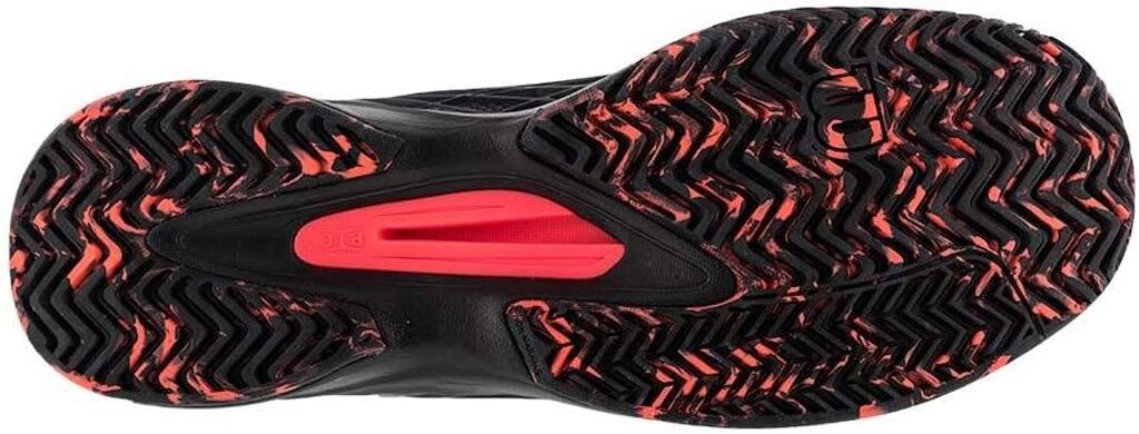 This is a tennis shoe for men that offers speed, flexibility, and comfort on the court. It has a synthetic and mesh upper in a black and gray color scheme with red accents. It features a Dynamic Fit technology that provides a cushioned and adaptive fit for the foot. It also has a Pro Torque Chassis Light that supports the arch and stability of the foot during lateral movements. The shoe has a Duralast rubber outsole that delivers durability and traction on all types of surfaces. The shoe is lightweight and breathable and has a lace-up closure. It is a great choice for players who need agility and responsiveness on the court.
