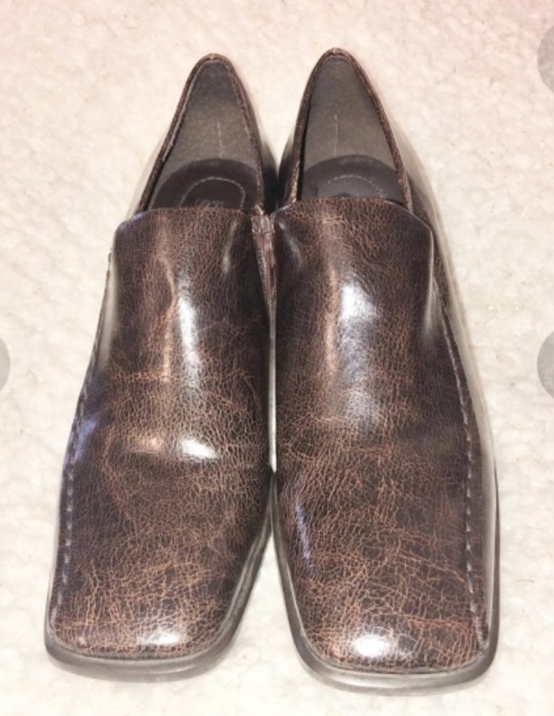 Franco Sarto faux brown leather slip on heel loafers with side interior zippers for easy pull on. Stitching down the front of both side sides of the toolbox for some extra style. Size 6.
