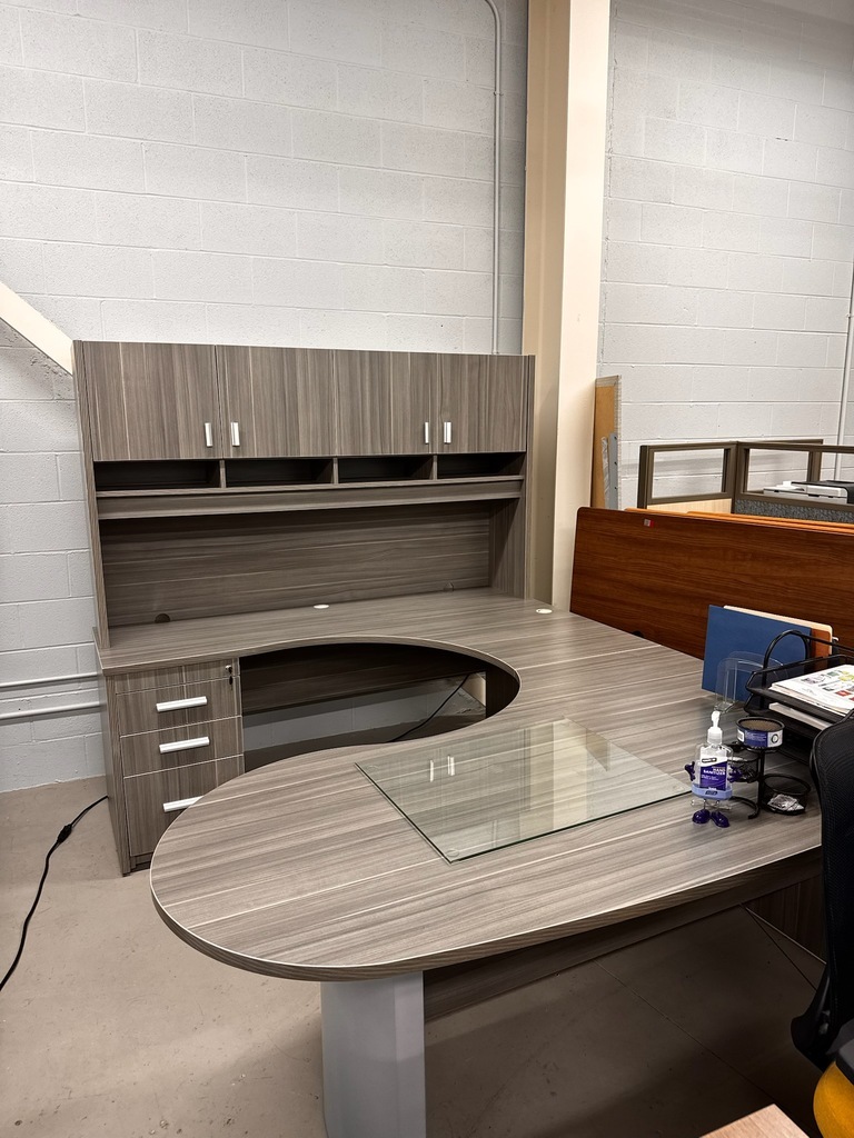 This spacious U-shaped workstation includes a hutch and ample storage. Perfect for maximizing your office efficiency! For pickup only, Monday through Friday, between 8:00 AM and 4:00 PM.