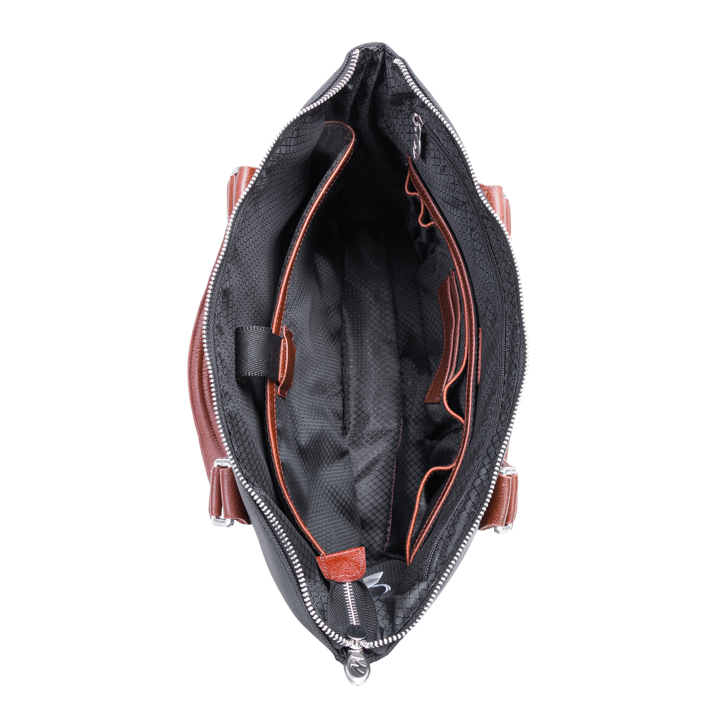 Carry all your important devices in this 15” nylon laptop and tablet briefcase designed with elegant contrasting leather accents. Conveniently access your essential items safely in its hidden full-length front zipper pocket. Its fully lined interior is accented in leather trim and silver hardware securing your items with lockable zipper. Well-designed full-length interior zipper pocket and business accessory organizer help make your day go smoothly. Exterior back zipper pocket for easy access to your most needed items (cellphones, keys, etc.) Transport in comfort with our non-slip contour padded removable shoulder strap. And set it down with confidence on 5 protective metal feet.