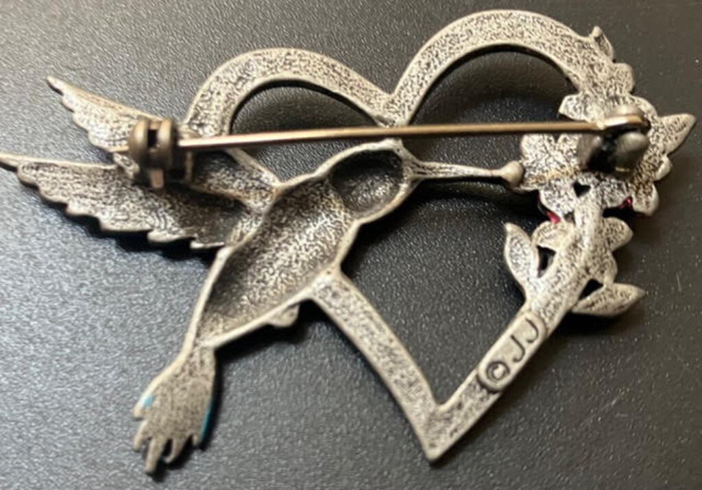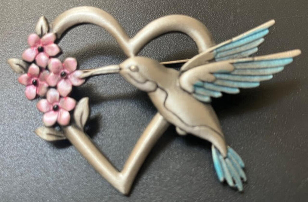 New JJ Signed Hummingbird Heart Brooch. Made of Silver Pewter with Pink Flowers. Measures 2” Across; 1 1/2” High.