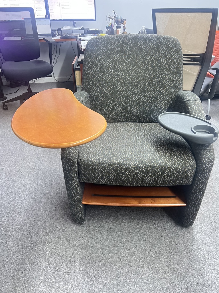 This chair features a soft upholstered seat, built-in side table, and integrated cup holder—perfect for lounge areas, break rooms, or collaborative spaces.