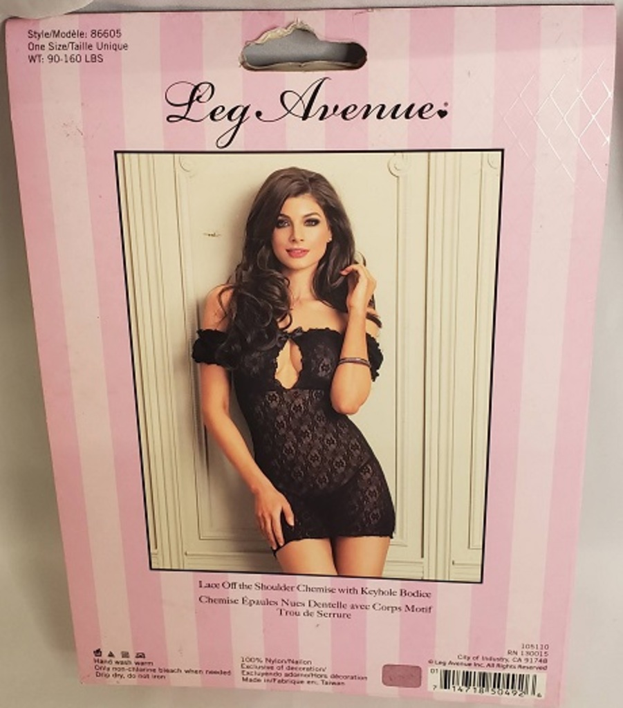 Lycra blend. This distinctive off the shoulder lace chemise has a keyhole bodice. It is comfortable, sexy and well-made. Ideal for that special occasion. Made in China. Original Leg Avenue lingerie product. FITTING GUIDE: One size fits most.