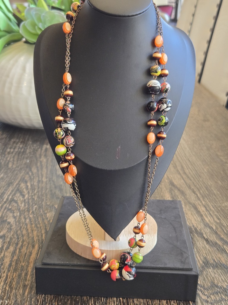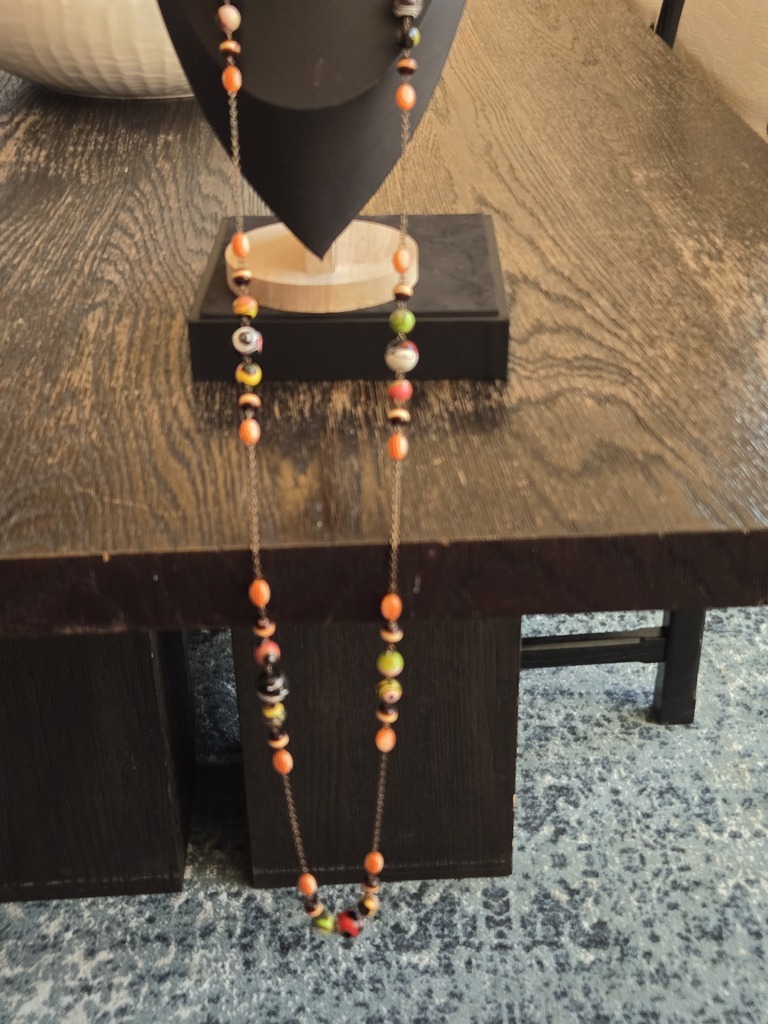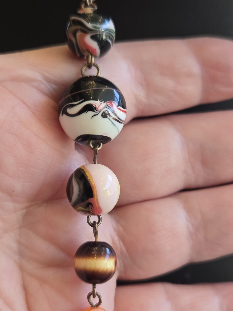 These are likely dipped to create a marveled effect over top of the beads. On breast chain. Very long.