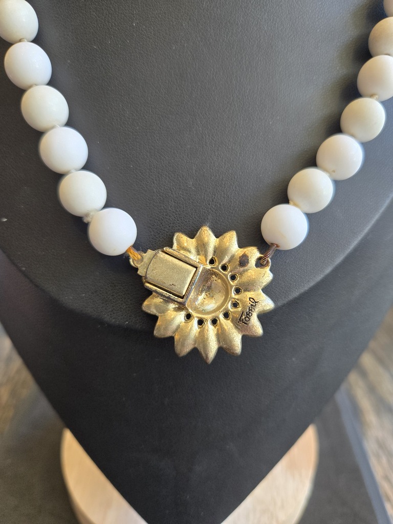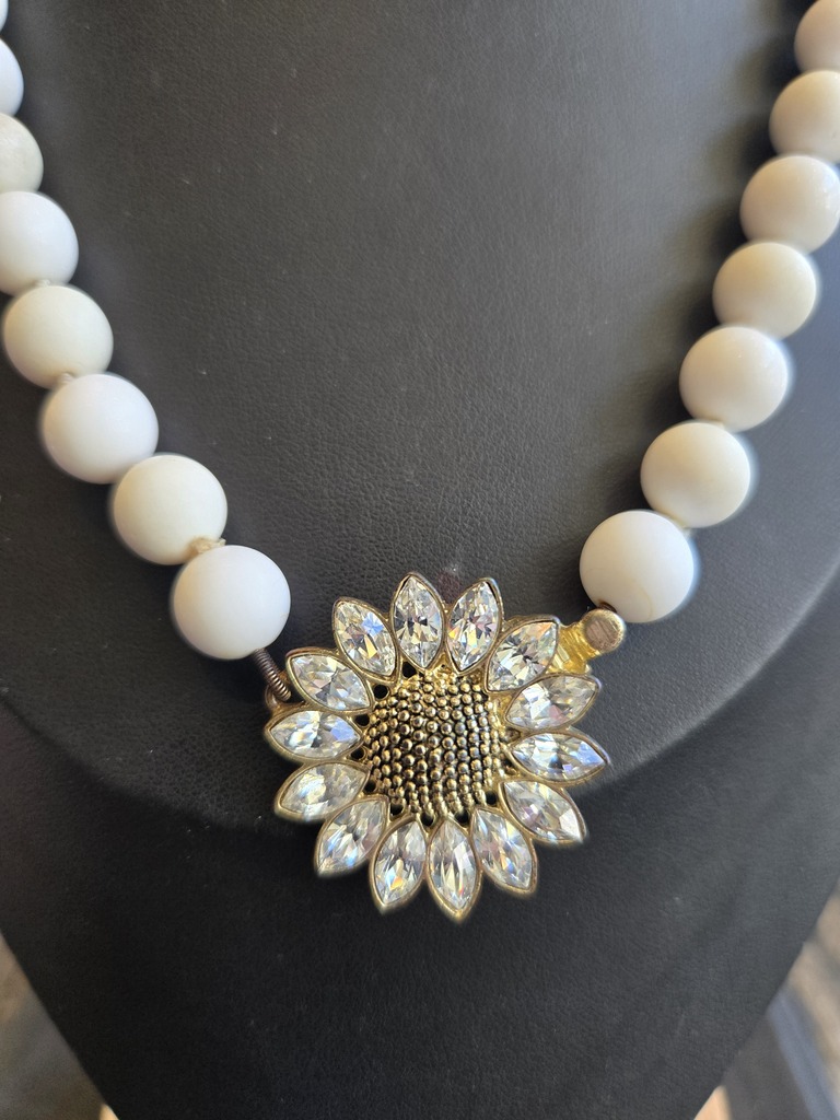 Floral pendant that is also the clasp. The beads alternate between white and off white. The beards are knotted in between.