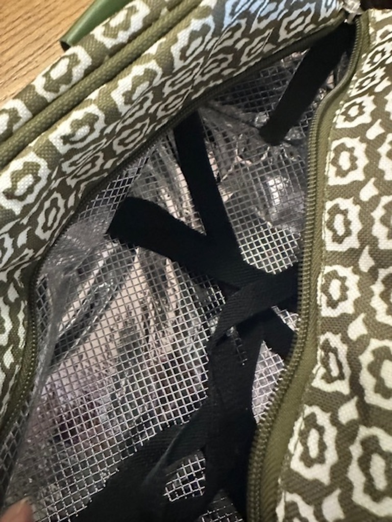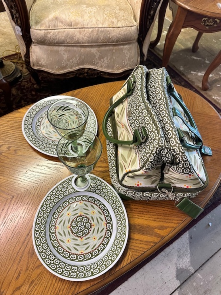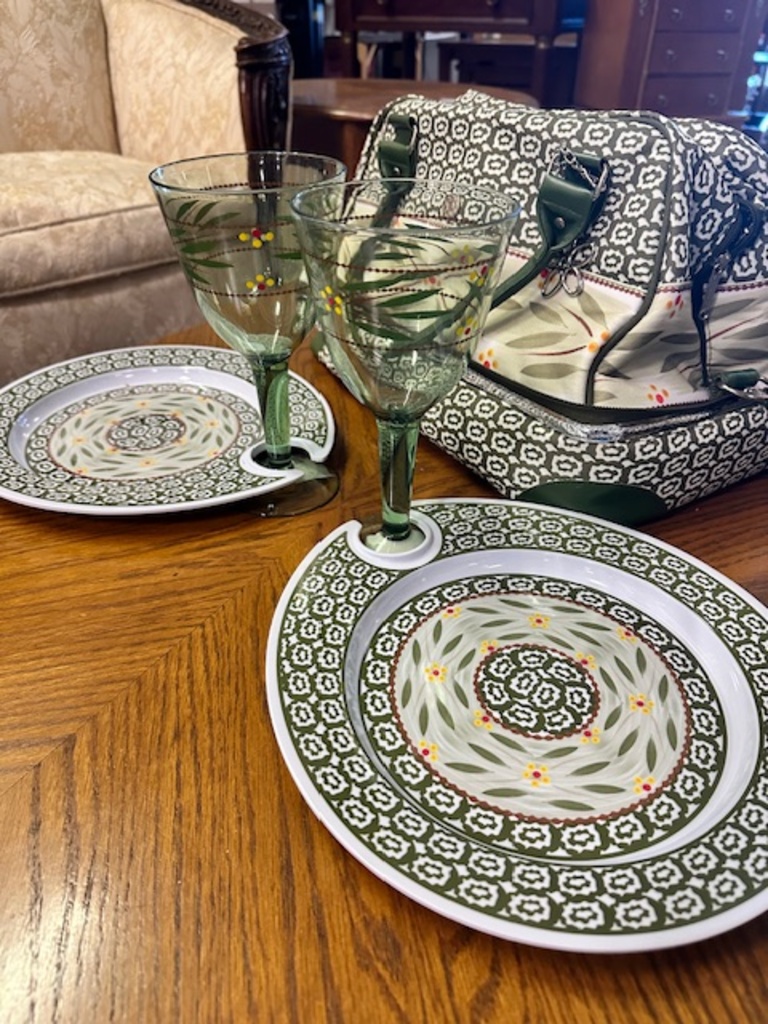 This adorable picnic basket includes two plates and two wine glasses. Inside is insulated. And there is a compartment on the bottom as well!