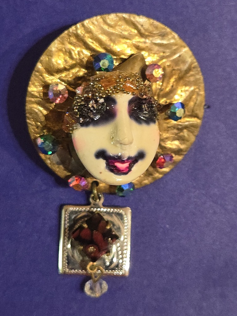 Ceramic hand-painted lady face is mounted on a circular gold-hammered metal piece