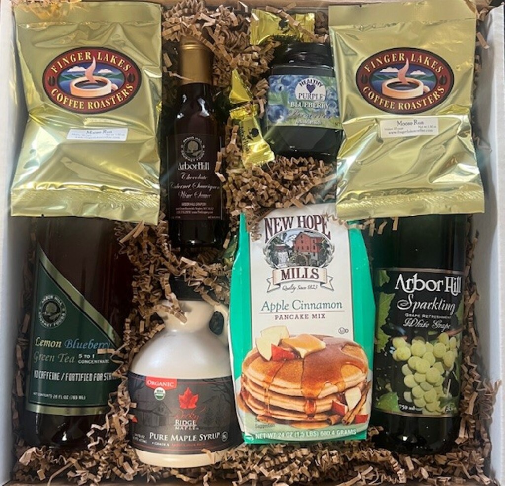 All you need for a Sunday morning. This gift box includes: Apple Cinnamon Pancake Mix, 16oz jug of NYS Maple Syrup, 750ml bottle of Sparkling White Grape Juice, 750ml bottle of Lemon Blueberry Iced Tea Concentrate, 2 bags of Finger Lakes Coffee Roasters coffee, 6oz bottle of Chocolate Cabernet Sauvignon Wine Sauce and a 10oz jar of Blueberry Preserves.