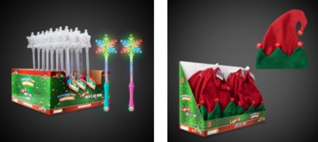Get ready to spread holiday cheer with our best-selling LED Elf Hat, now available in a 24-count retail counter display! These vibrant green & red elf hats are perfect for holiday parties, parades, plays, and festivals, adding a playful touch to any celebration. Each hat features 4 flashing red LEDs that create a dazzling light effect, sure to delight any crowd. With 3 AG13 batteries included & installed, these hats are ready to shine right out of the box. Sold in a convenient retail display of 24 hats, please order in increments of 1 display to ensure your festivities are merry & bright!