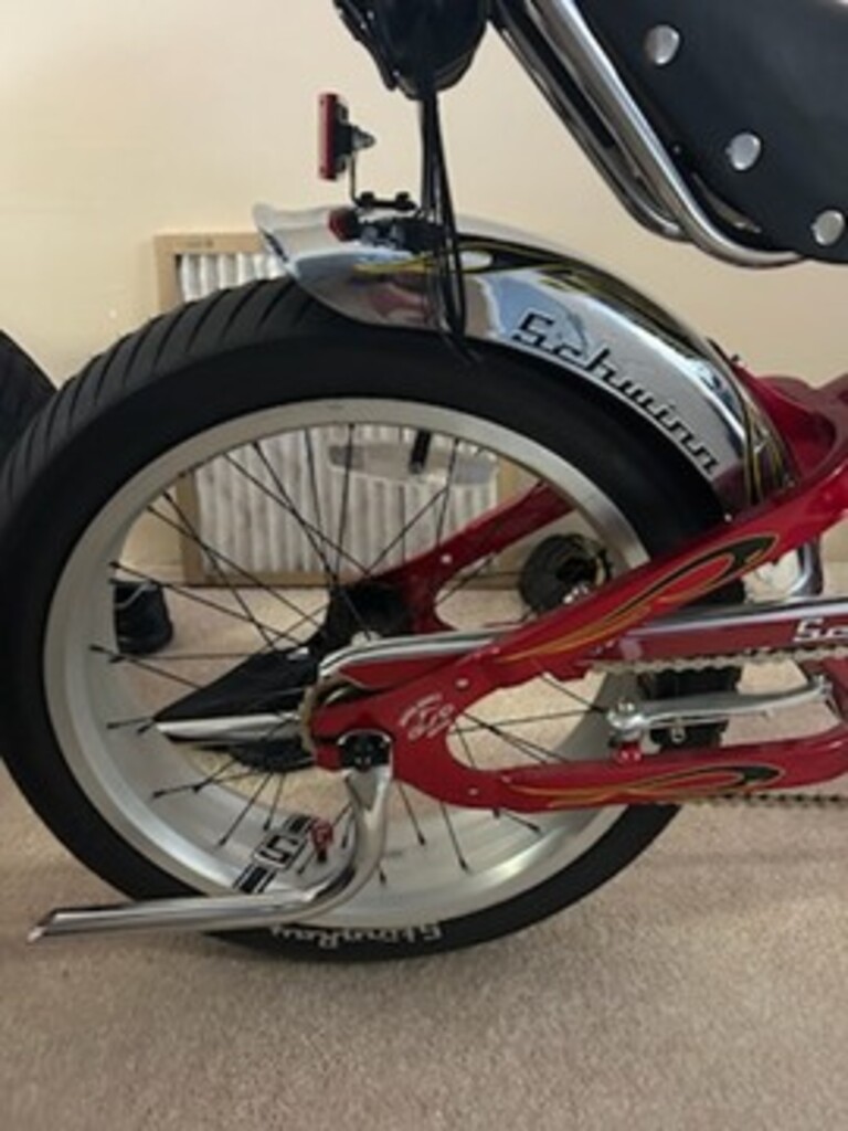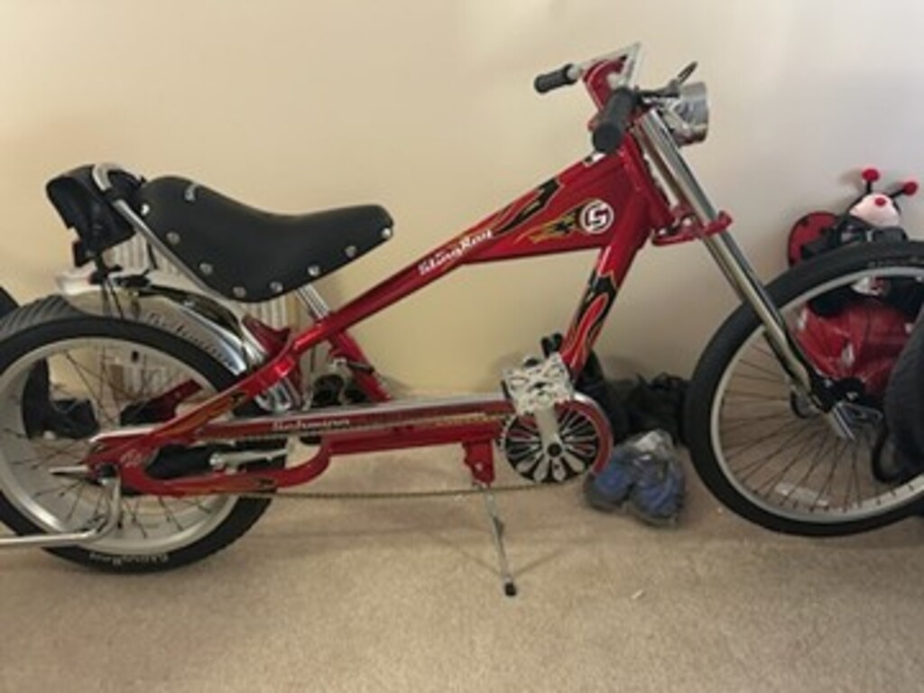 1st Edition Schwinn Orange County Chopper Bicycle. Sting Ray. This is a hard to find bike and only 3500 were made and a great ride to add to your collection, Limited Edition 20" Blk/Orange Bike ! These bicycles were only sold between 2004 and 2006 and they have now become a collector’s item, especially since the show is off the air. Orange County Choppers and Schwinn have worked together to develop this super cool bike and a collectors dream, this bike will only go up in value. The motorcycle sized back tire, the chrome, saddle look, long drawn out front wheel, double peg kick stand. Features: *Custom stretched chopper frame with gas tank and gusset. * 20" x4" super wide V line rear slick tire. * 24" x 2" narrow front tire mounted on extruded alloy rims. * Adjustable cruising saddle with built in sissy bar, riveted upholstery and Schwinn embossed logo. * Dual crown Sting-Ray twin barrel chrome forks with color matching paint. * Chrome steel chain guard and heavy duty double leg kickstand. * * Alloy linear pull brake with alloy lever. * 3 piece custom Sting-Ray cranks with iron cross pedals. * Sporty and stylish front fender.