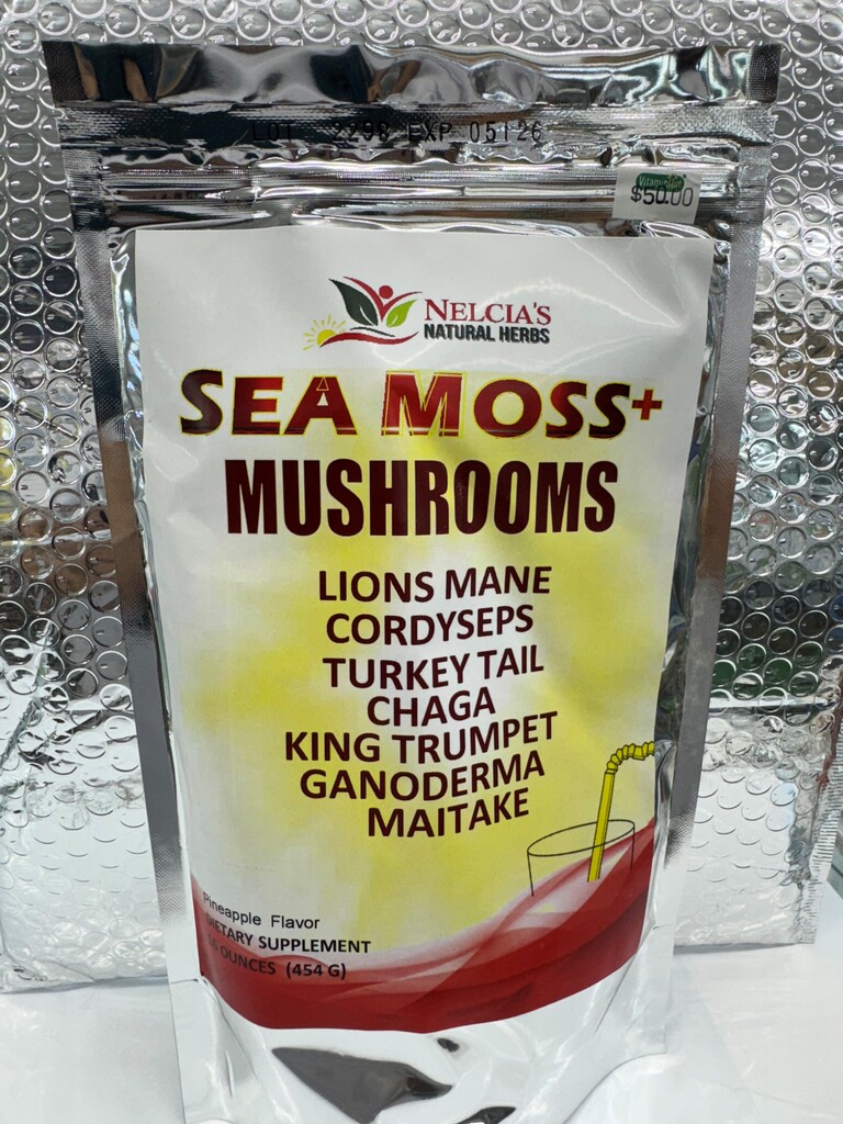 Sea Moss mushrooms with lions mane, cordyceps, turkey tail, chaga, king trumpet Ganoderma and maitake.