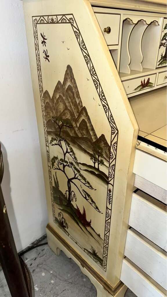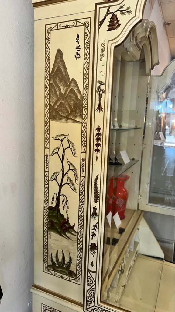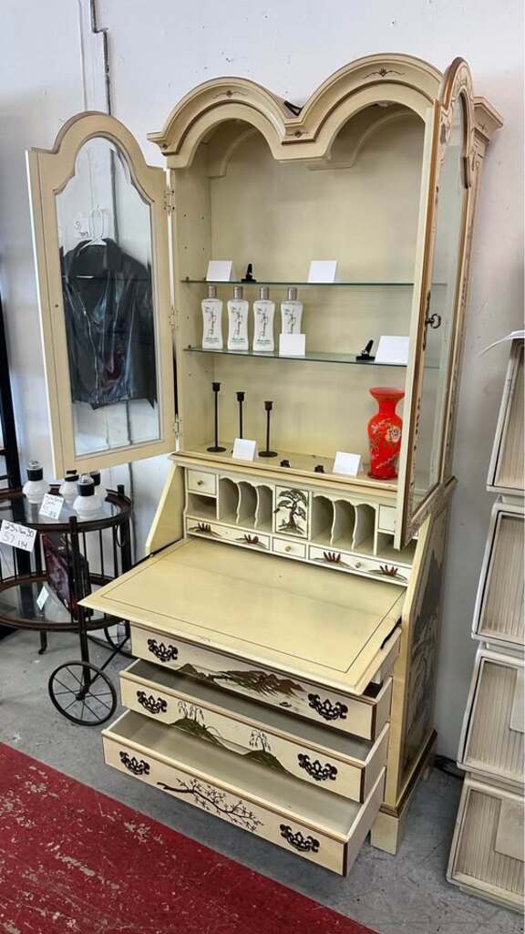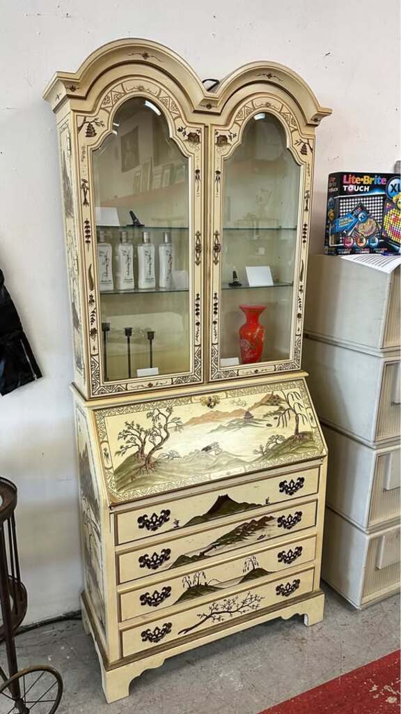 Chinoiserie secretary desk with a hutch. Likely from the mid-to-late 20th century, that features a drop-front writing surface in the lower section and a glass-door display cabinet on top.
