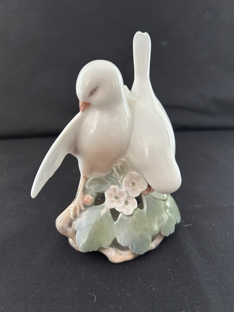 The Royal Copenhagen Denmark Porcelain Lovebirds Figurine No. 402 is a beautifully crafted decorative collectible featuring a pair of lovebirds made from high-quality porcelain and stands 5 1/2" tall. This figurine, originating from Denmark, showcases intricate details and a charming design that adds a touch of elegance to any space. With its brand reputation and exquisite craftsmanship, this piece is a perfect addition for collectors or those looking to enhance their home decor with a unique and timeless piece.