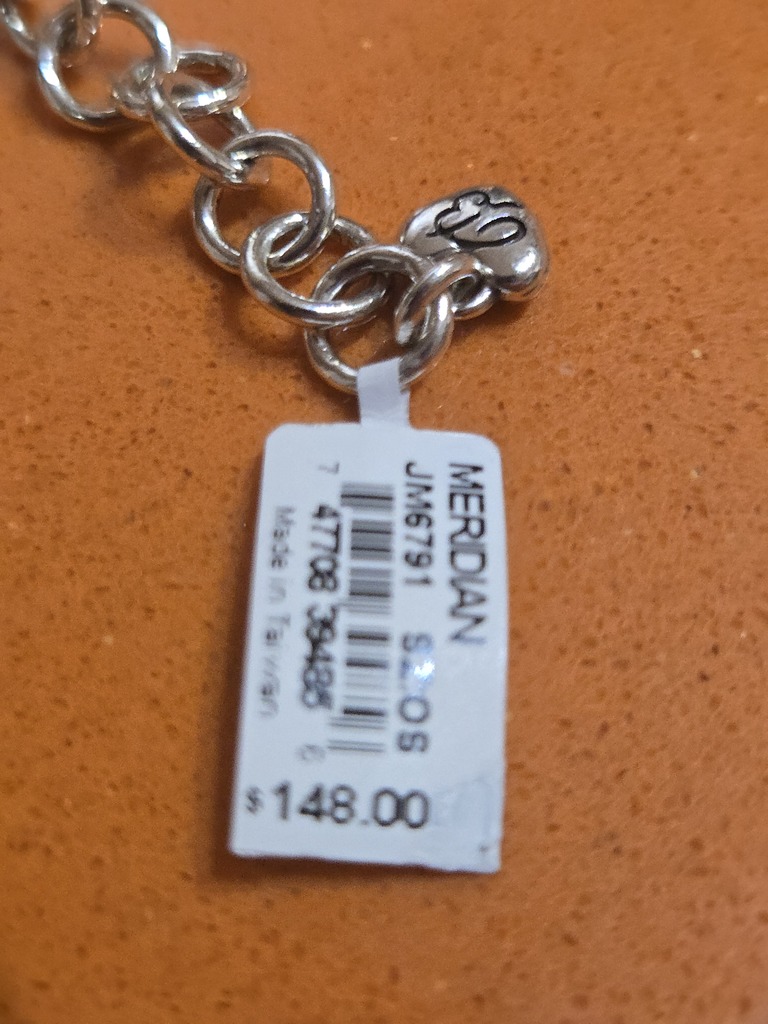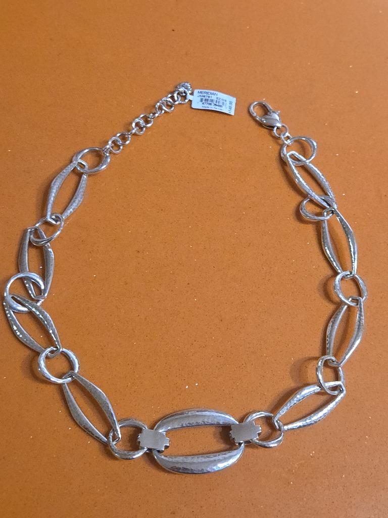 Unique design has ovals and circles linked together Large oval link in center is connected on both sides by 2 rhinestone pieces Has a 9" drop around neck