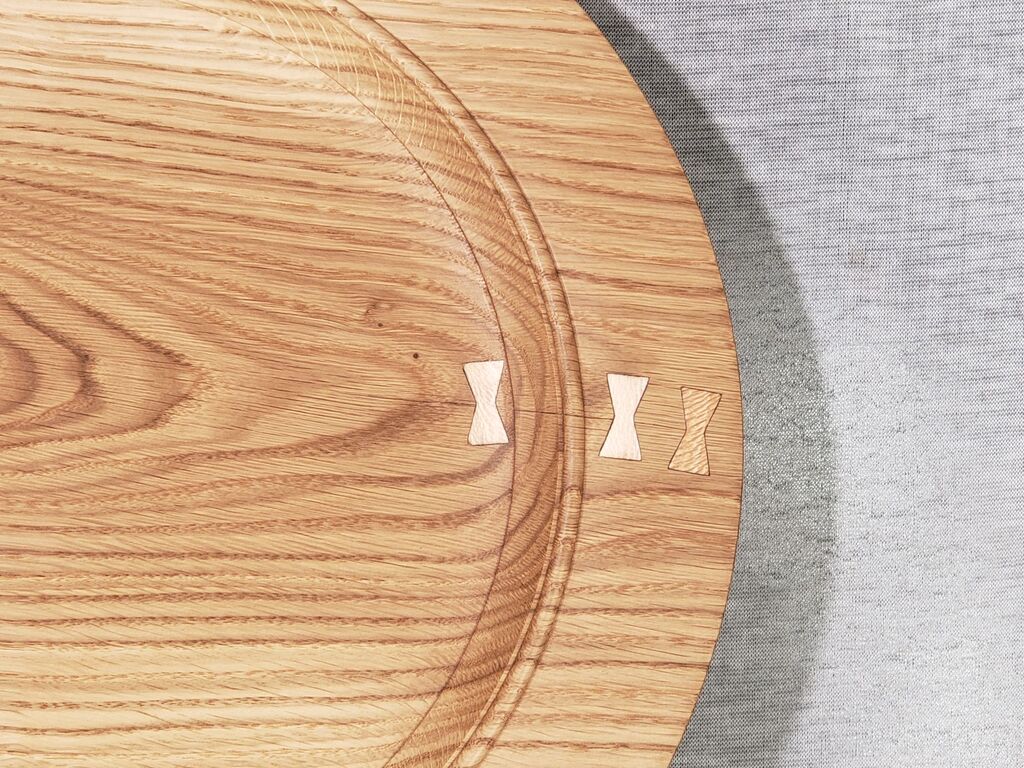 As you can see in the pictures there was a crack in the rim. It was a tight crack, but to stabilize and secure the crack I used several Quartersawn Sycamore "Pewa" or Butterfly patches. The Hawaiian's of old have used Pewa to repair bowls and vessels for hundreds of years, and to them when an item was repaired it meant more or had higher value to them since the owner cared enough to have it repaired. The Pewa patches strengthen the crack and keep the wood from moving or cracking any further. The repaired area is just as strong as the surrounding wood, but is also adds a decorative feature that now sets this serving tray apart from any other. One of the Sycamore patches must have been made from a different piece of wood as it is much darker in color than the other patches.
