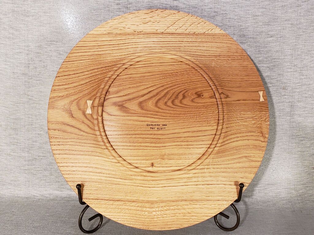 Beautiful wooden serving tray or platter made from an urban Colorado English Oak tree. There aren't very many Oak trees where I live, and this was the first English Oak I've run across. English Oak (also called European Oak) has been rated as having very good resistance to decay, and is commonly used in boatbuilding applications. English Oak falls into the White Oak group, which makes it excellent for kitchen items (bowls, plates, platters), as far as durability and it is a tighter grained wood than Red Oak.