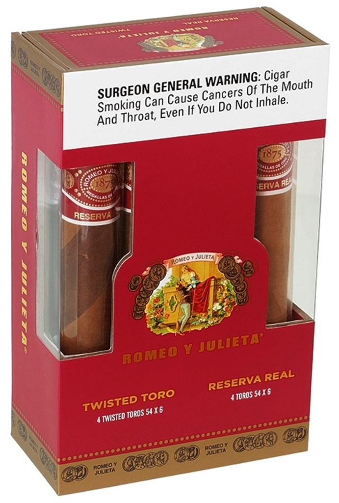 This is an eight cigar sampler package of Romeo Y Julieta Reserva Real Hero Cigars. You will receive four Connecticut Shade Toro cigars and your will receive four Twisted Toro (Barber Pole) cigars.