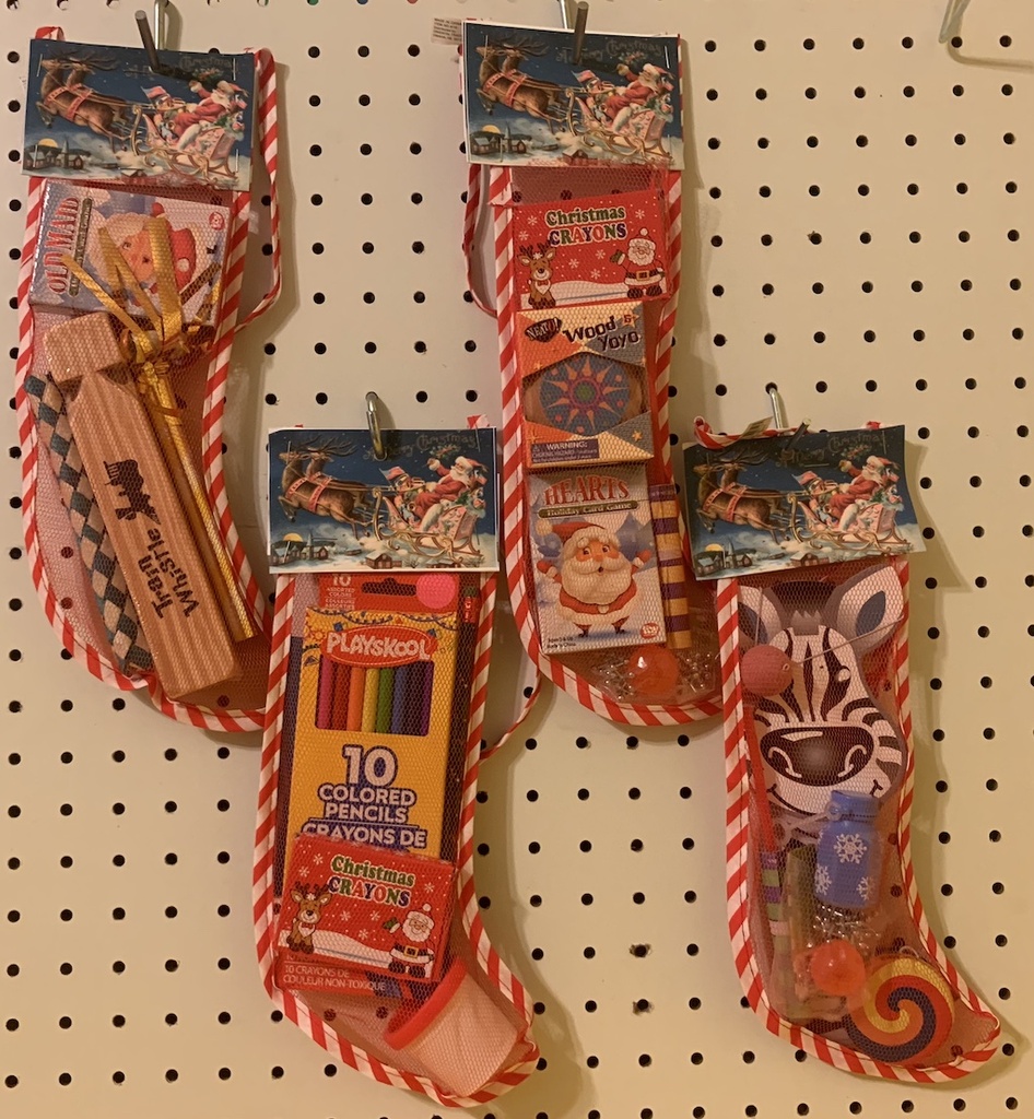 Assortment D: Four (4) medium 12” Stockings stuffed full with toys, games, and fun things to do. They make great giveaways. Each one is different, and contents will vary, but include a variety of Wooden YoYo, colored pencils, paddle ball, crayons, party favors, Chinese yoyo, and Christmas pencil.