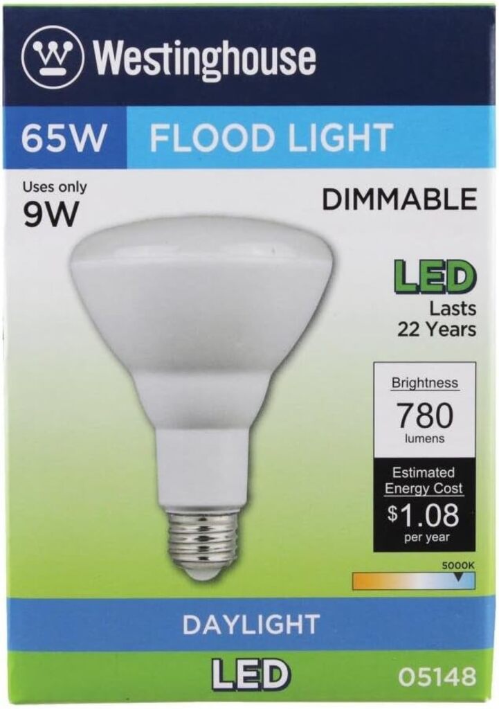 Westinghouse 9-Watt Br30 flood dimmable LED light bulbs (6-pack) with medium base reduce energy and operating costs up to 84 percent compared to a standard incandescent bulb with the same brightness. Ideal for use in recessed and track lighting, the Br30 bulbs turn on instantly to full brightness and produce an energizing light resembling daylight, perfect for overall and task lighting. Suitable for use in damp locations such as outdoor lighting and can be used in totally enclosed fixtures. Leds contain no harmful mercury. Westinghouse is a trusted, global brand. Westinghouse knows lighting and offers products with exceptional quality, reliability and functionality. Product reference number 05148.