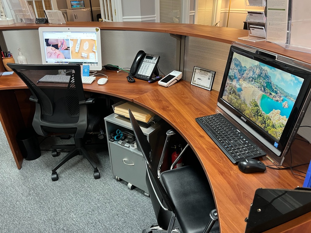 This lightly used semi-circle receptionist desk features translucent panels and comes in two pieces. This desk will be sure to help you make a great first impression for your clients and customers. Unit can be picked up in Elmhurst, IL.