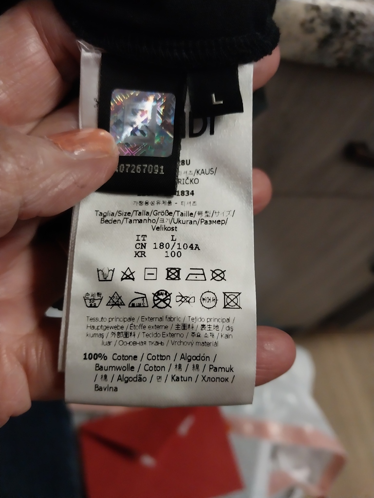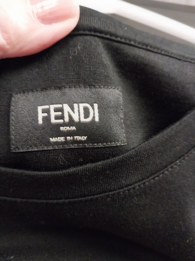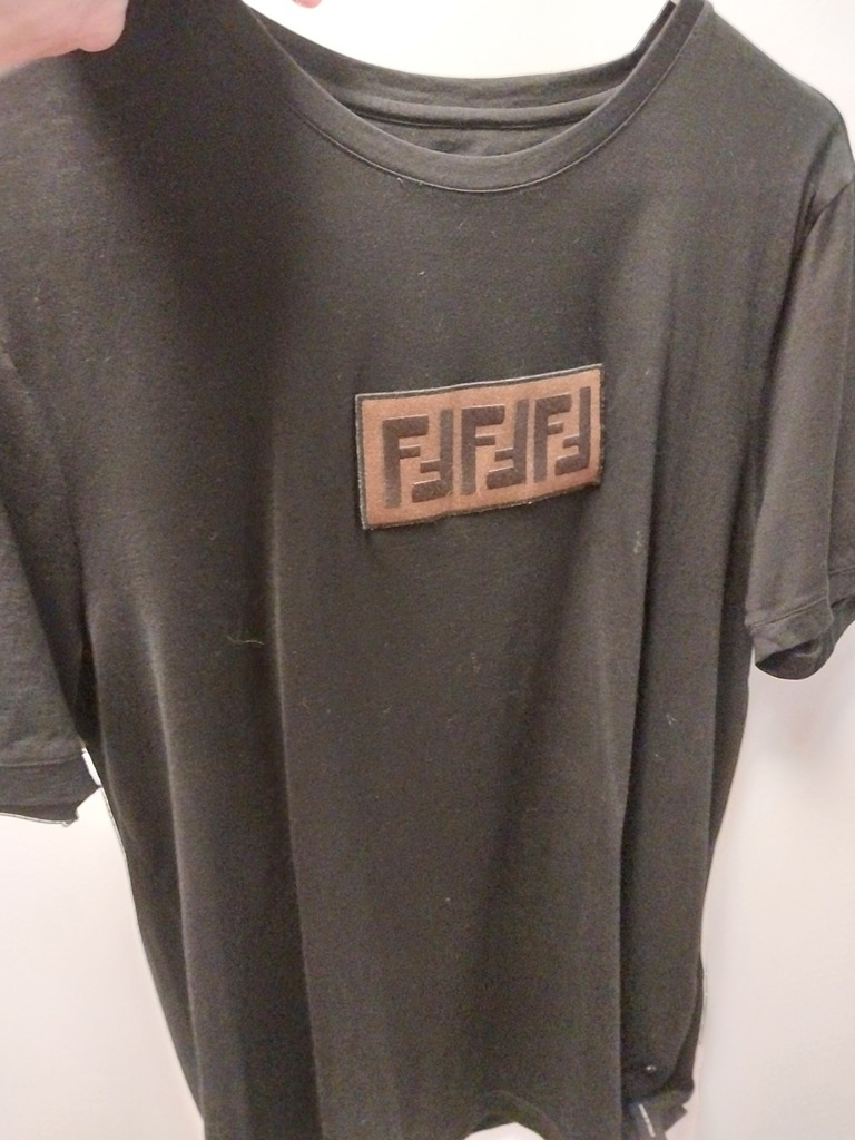 Fendi ff box logo black t-shirt with brown emblem; size large; pre-owned, like new.